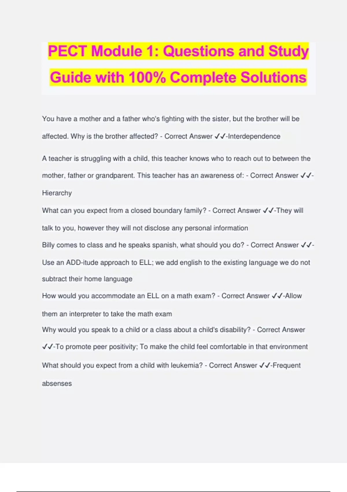 PECT Module 1: Questions and Study Guide with 100% Complete Solutions You have a mother and a father who's fighting with the sister, but the brother will be affected. Why is the brother affected? - Correct Answer ️️ -Interdependence A teacher is struggling with a child, this teacher knows who to reach out to between the mother, father or grandparent. This teacher has an awareness of: - Correct Answer ️️ - Hierarchy What can you expect from a closed boundary family? - Correct Answer ️️ -They will talk to you, however they will not disclose any personal information Billy comes to class and he speaks spanish, what should you do? - Correct Answer ️️ - Use an ADD-itude approach to ELL; we add english to the existing language we do not subtract their home language How would you accommodate an ELL on a math exam? - Correct Answer ️️ -Allow them an interpreter to take the math exam Why would you speak to a child or a class about a child's disability? - Correct Answer ️️ -To promote peer positivity; To make the child feel comfortable in that environment What should you expect from a child with leukemia? - Correct Answer ️️ -Frequent absenses If a child has a physical disability, what kind of accommodation would you provide to them on an exam? - Correct Answer ️️ -Use the same accommodations and materials you've used throughout the semester You have an ELL student who is proficient in English and performs well on exams, but does not participate in class discussions. Why? - Correct Answer ️️ -He is lacking self confidence You have a struggling student in your class, what do you need in order to support this student? - Correct Answer ️️ -You need parent permission before allowing students to work with spled teacher or IEP What do you need permission for? - Correct Answer ️️ -Pictures and social media posts of children What causes cognitive deficits in children - Correct Answer ️️ -Lead Paint What does it mean to place a child in their least restrictive environment - Correct Answer ️️ -The most normal, average education while providing extra help You have a child who cannot sit still, and they bring in an assembly. He has ADHD and you want to provide an accommodation. What should you do? - Correct Answer ️️ - Give them space to be in the assembly but have room to move around freely What do you do with a child who has poor vision. They still want to sit with their friends. What is an appropriate accommodation? - Correct Answer ️️ -Give them a copy of the slides, so they can follow along Who has to be in an IEP meeting? - Correct Answer ️️ -Administrators; i.e. Principals What is summative assessment? - Correct Answer ️️ -A big unit test, goes with standards and changing the curriculum. It is the final evaluation of students' achievement of standards What is formative assessment? - Correct Answer ️️ -An informal assessment; i.e. Thumbs up, weekly spelling tests, exit slip, etc. What is an authentic assessment? - Correct Answer ️️ -naturalistic observation of skill. Real world learning ; i.e. showing actual rocks to teach rocks, weather report to teach weather: Portfolio is top form of authentic assessment What is Pre-K counts? - Correct Answer ️️ -Gov't funded program to provide Pre-K to underprivileged children. A way to close the academic achievement gap A discloses abuse to you. The child then b