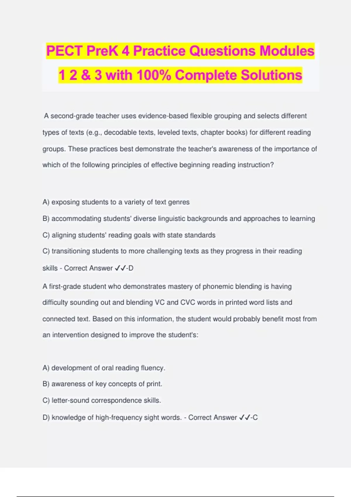 PECT PreK 4 Practice Questions Modules 1 2 & 3 with 100% Complete Solutions A second-grade teacher uses evidence-based flexible grouping and selects different types of texts (e.g., decodable texts, leveled texts, chapter books) for different reading groups. These practices best demonstrate the teacher's awareness of the importance of which of the following principles of effective beginning reading instruction? A) exposing students to a variety of text genres B) accommodating students' diverse linguistic backgrounds and approaches to learning C) aligning students' reading goals with state standards C) transitioning students to more challenging texts as they progress in their reading skills - Correct Answer ️️ -D A first-grade student who demonstrates mastery of phonemic blending is having difficulty sounding out and blending VC and CVC words in printed word lists and connected text. Based on this information, the student would probably benefit most from an intervention designed to improve the student's: A) development of oral reading fluency. B) awareness of key concepts of print. C) letter-sound correspondence skills. D) knowledge of high-frequency sight words. - Correct Answer ️️ -C In a fourth-grade class, providing explicit instruction focused on which of the following reading skills would most directly promote students' evaluative reading comprehension skills? A) summarizing the main idea of an extended text B) retrieving information from a text to answer comprehension questions C) applying background knowledge to visualize processes described in a text D) distinguishing between fact and opinion in a text - Correct Answer ️️ -D 4. A kindergarten student writes "tdirdmibk" in her journal and tells the teacher she wrote "Today I rode my bike." The student's writing sample most clearly demonstrates which of the following milestones essential to spelling development in English? A) awareness of the alphabetic principle B) knowledge of print conventions for representing words C) awareness of morphological structure within words D) knowledge of syllable juncture - Correct Answer ️️ -A After an extended classroom discussion of the pros and cons of adopting a civic initiative, students are divided into two relatively equal groups, one of which supports the initiative while the other has reservations about it. The teacher could best use this situation to demonstrate the value of which of the following practices? A) assessing the costs and benefits in group decision making B) using compromise to resolve conflicts C) dividing problems into more manageable parts in group decision making D) using majority rule to resolve conflicts - Correct Answer ️️ -B Fourth-grade students are working in small groups to create dances to a song they have chosen. As they work, their teacher makes anecdotal notes on the students' discussions, work styles, and use of concepts related to movement and choreography that the class has previously studied. The teacher can best use these notes to accomplish which of the following goals? A) establishing the connection between the lesson and state arts standards B) determining students' final grades for the project C) planning tasks and questions for an upcoming arts exam D) documenting individual students' understanding and growth - Correct Answer ️️ -D During a learning activity about the oceans, a teacher has students solve problems involving starfish (five legs) and crabs (ten legs). Which of the following problems could the teacher use to demonstrate that some problems have more than one answer? A)Three crabs and two starfish were on the beach. How many legs were there altogether? B) I saw 15 legs. How many crabs and starfish did I see? C) Two crabs have how many more legs than three starfish? D) One crab was walking in the sand. How many starfish have the same total number of legs? - Correct Answer ️️ -B A first-grade class is learning about light using mirrors and flashlights. After showing the class how mirrors and a variety of shiny objects reflect light, the teacher asks students if nonshiny objects can reflect light. The teacher hands out small flashlights to the students and asks them to explore this question. Which of the following strategies would be most effective for the teacher to use to help the students develop the ability to clearly explain what they learn from their exploration of reflected light? A) discussing with each student what he or she is finding out about the reflection of light as the explorations are being conducted C) structuring the students' explorations by having them