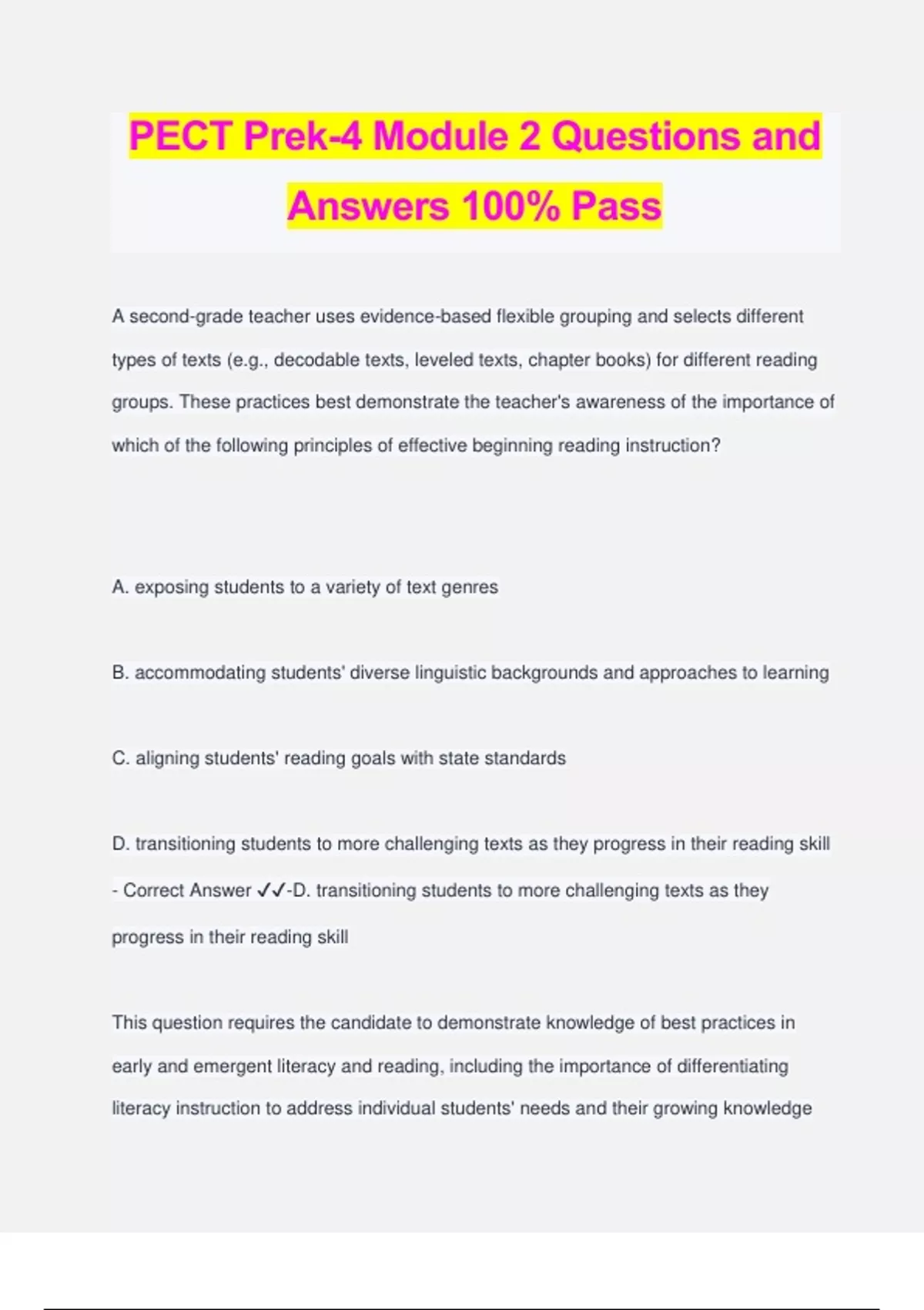 PECT Prek-4 Module 2 Questions and Answers 100% Pass A second-grade teacher uses evidence-based flexible grouping and selects different types of texts (e.g., decodable texts, leveled texts, chapter books) for different reading groups. These practices best demonstrate the teacher's awareness of the importance of which of the following principles of effective beginning reading instruction? A. exposing students to a variety of text genres B. accommodating students' diverse linguistic backgrounds and approaches to learning C. aligning students' reading goals with state standards D. transitioning students to more challenging texts as they progress in their reading skill - Correct Answer ️️ -D. transitioning students to more challenging texts as they progress in their reading skill This question requires the candidate to demonstrate knowledge of best practices in early and emergent literacy and reading, including the importance of differentiating literacy instruction to address individual students' needs and their growing knowledge and skills. Providing early readers with guided practice reading connected text corresponding to their individual level of phonics knowledge is essential for promoting their ongoing fluency development. Evidence-based flexible grouping is the practice of varying the size and composition of instructional groups according to the goals of instruction and the demonstrated learning needs of individual students, as evidenced in ongoing informal assessments. Using this approach to plan reading groups allows the teacher to group together students with similar reading levels for instruction using a text at an appropriate level of challenge for those students. Furthermore, the teacher can closely monitor student progress and regularly adjust the composition of groups and assigned texts, thus transitioning individual students to more challenging texts as they progress in their reading skills A first-grade student who demonstrates mastery of phonemic blending is having difficulty sounding out and blending VC and CVC words in printed word lists and connected text. Based on this information, the student would probably benefit most from an intervention designed to improve the student's: A. development of oral reading fluency. B. awareness of key concepts of print. C. letter-sound correspondence skills. D. knowledge of high-frequency sight words - Correct Answer ️️ -C. letter-sound correspondence skills. This question requires the candidate to apply knowledge of interventions in phonics. Knowledge of letter-sound correspondences and phonemic blending skills is key for developing the early phonics skill of sounding out and blending simple, phonically regular VC and CVC words. Knowledge of letter-sound correspondences is required to decode the component sounds from the sequence of letters, and skill in phonemic blending is needed to combine the sounds into a single word. The student described has mastered phonemic blending, so the likely source of the student's difficulty with this task is in correctly identifying the sounds represented by the letters in the printed words. In a fourth-grade class, providing explicit instruction focused on which of the following reading skills would most directly promote students' evaluative reading comprehension skills? A. summarizing the main idea of an extended text B. retrieving information from a text to answer comprehension questions C. applying background knowledge to visualize processes described in a text D. distinguishing between fact and opinion in a text - Correct Answer ️️ -D. distinguishing between fact and opinion in a text This question requires the candidate to recognize different levels of comprehension. Readers exercise evaluative reading comprehension when they apply criteria external to a text to analyze the text or its content (e.g., evaluating the accuracy of the facts presented, evaluating the effectiveness of stylistic choices). Authors of informational texts may occasionally identify personal opinions in the text explicitly. In general, however, readers must consider what they know about the word meanings (e.g., best, good, disappointing) or what they know about the world (e.g., whether a particular statement could be verified objectively) in order to distinguish statements of fact from statements of opinion in these texts A kindergarten student writes "tdirdmibk" in her journal and tells the teacher she wrote "Today I rode my bike." The student's writing sample most clearly demonstrates which of the following milestones essential to spelling development in English? A. awareness of the alphabetic principle B. knowledge of print conventions for representing words C. awareness of morphological structure within words D. knowledge of syllable juncture - Correct Answer ️️ -A. awareness of the alphabetic principle This question requires the candidate to apply knowledge of assessment in writing skills, including interpreting the results of assessments. The sequence of letters tdirdmibk in the student's writing sample corresponds to prominent sounds in the spoken sentence the writing represents. The letters td correspond to the first sounds in each syllable of the word today; the letter i represents the word I; the letters rd correspond to the consonant sounds in the word rode; the letters mi correspond to all the sounds in the word my; and the letters bk represent the consonant sounds in the word bike. The student's spelling is typical of emergent writers in an early stage of spelling development, and reflects an awareness of the alphabetic principle—the understanding that the writing system in English is alphabetic, i.e., that the letters used in written English represent the component sounds in spoken words After an extended classroom discussion of the pros and cons of adopting a civic initiative, students are divided into two relatively equal groups, one of which supports the initiative while the other has reser
