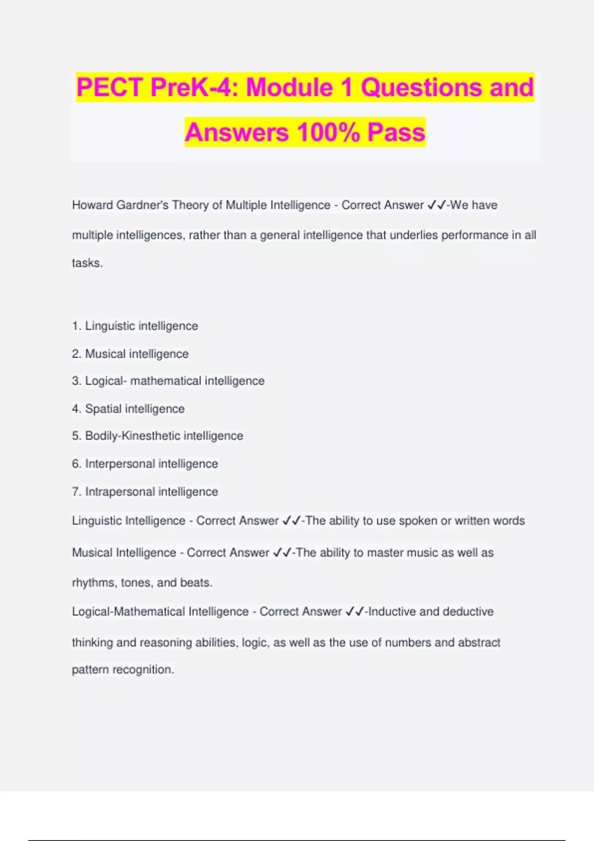 PECT PreK-4: Module 1 Questions and Answers 100% Pass Howard Gardner's Theory of Multiple Intelligence - Correct Answer ️️ -We have multiple intelligences, rather than a general intelligence that underlies performance in all tasks. 1. Linguistic intelligence 2. Musical intelligence 3. Logical- mathematical intelligence 4. Spatial intelligence 5. Bodily-Kinesthetic intelligence 6. Interpersonal intelligence 7. Intrapersonal intelligence Linguistic Intelligence - Correct Answer ️️ -The ability to use spoken or written words Musical Intelligence - Correct Answer ️️ -The ability to master music as well as rhythms, tones, and beats. Logical-Mathematical Intelligence - Correct Answer ️️ -Inductive and deductive thinking and reasoning abilities, logic, as well as the use of numbers and abstract pattern recognition. Spatial Intelligence - Correct Answer ️️ -The ability to mentally visualize objects and spatial dimensions. Body-Kinesthetic Intelligence - Correct Answer ️️ -The wisdom of the body and the ability to control physical motion. Interpersonal intelligence - Correct Answer ️️ -The ability to communicate effectively with other people and to be able to develop relationships. Intrapersonal Intelligence - Correct Answer ️️ -The ability to understand one's own emotions, motivations, inner states of being, and self-reflection. Interdisciplinary - Correct Answer ️️ -Planning a lesson to use two or more subjects Least Restrictive Environment - Correct Answer ️️ -Student who has a disability should have the opportunity to be educated with non-disabled peers, to the greatest extent appropriate. What comes first with an infant? - Correct Answer ️️ -A social smile Norm-Referenced Test - Correct Answer ️️ -Report whether test takers performed better or worse than the hypothetical average student Compare a student's performance against a national or other "norm" group. Comparing individuals to others in a group. •IQ Tests •SAT •ACT Criterion-Referenced Test - Correct Answer ️️ -Designed to measure student performance against a fixed set of predetermined criteria or learning standards Measures a student's performance against a goal, specific objective, or standard. Designed to measure the results of instruction. •AP Exams •Unit Midterms/Final Exams What makes a test unbiased? - Correct Answer ️️ -Each student knows the material Portfolio - Correct Answer ️️ -A collection of students work that shows their progress over a period of time Rubric - Correct Answer ️️ -A tool used to evaluate students based objectives What is atypical in a 4 year old speech? - Correct Answer ️️ -Consists of repetitive phrases and repeated words Scope and Sequence Chart - Correct Answer ️️ -Shows what knowledge the curriculum teaches and the order in which it teaches the knowledge Bandura's Social Learning Theory - Correct Answer ️️ -Theorized that social interactions are the most important medium and influence for learning Children learn by observing and imitating the behaviors of models (Peers, Adults, Teachers, etc.) Spontaneous Play - Correct Answer ️️ -When children do an activity freely. Help language skills, thinking skills, fine motor, large motor, creative skills, social skills. How to create a culturally inclusive classroom environment? - Correct Answer ️️ -1. Self-assess own prejudice 2. Teach respect 3. Eliminate stigmas 4. Acknowledge differences 5. Embrace diversity 6. Teach tolerance 7. Promote acceptance 8. Celebrate community 9. Keep an open classroom Screening Assessments - Correct Answer ️️ -Assess to see if a student requires specialized assistance or services for developmental, physical, cognitive, or academic needs. Developmental screening is a short test to see if a chil