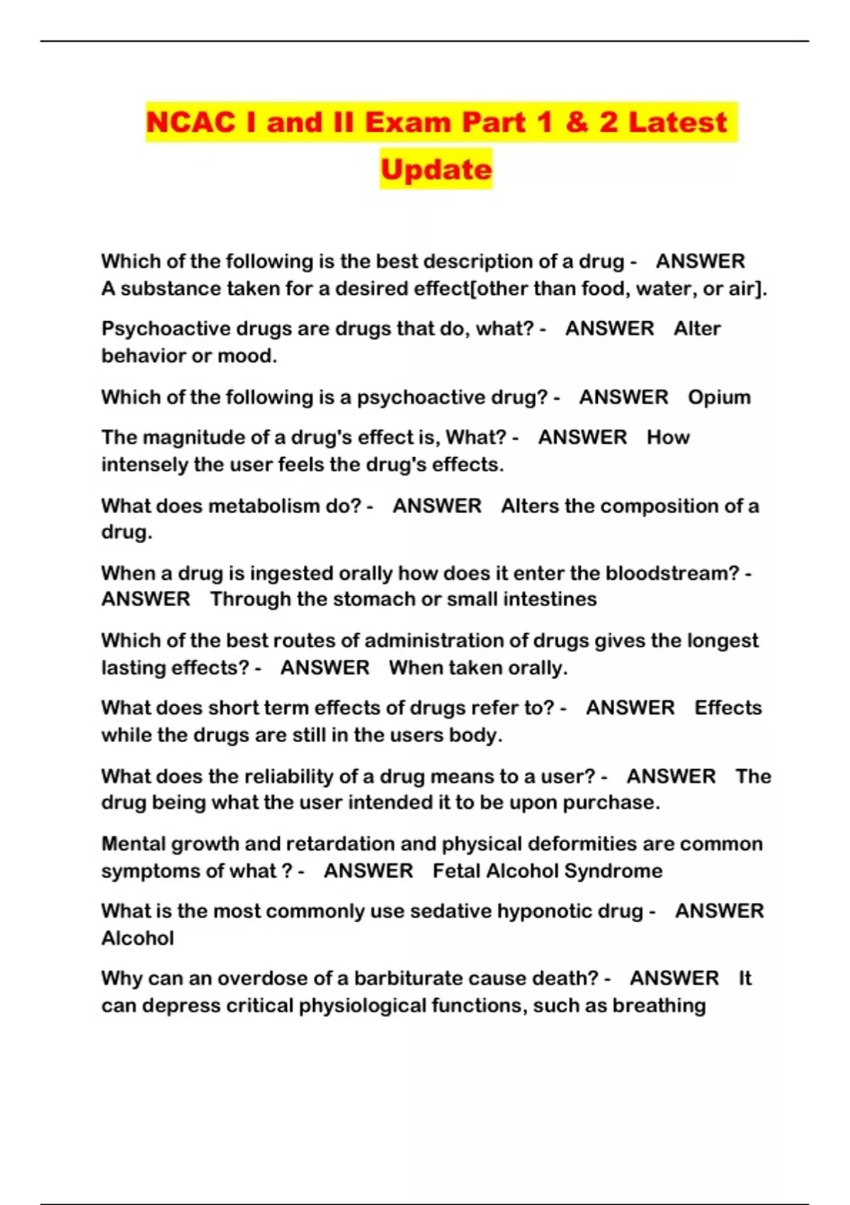 NCAC I and II Exam Part 1 & 2 Latest Update Which of the following is the best description of a drug - ANSWER A substance taken for a desired effect[other than food, water, or air]. Psychoactive drugs are drugs that do, what? - ANSWER Alter behavior or mood. Which of the following is a psychoactive drug? - ANSWER Opium The magnitude of a drug's effect is, What? - ANSWER How intensely the user feels the drug's effects. What does metabolism do? - ANSWER Alters the composition of a drug. When a drug is ingested orally how does it enter the bloodstream? - ANSWER Through the stomach or small intestines Which of the best routes of administration of drugs gives the longest lasting effects? - ANSWER When taken orally. What does short term effects of drugs refer to? - ANSWER Effects while the drugs are still in the users body. What does the reliability of a drug means to a user? - ANSWER The drug being what the user intended it to be upon purchase. Mental growth and retardation and physical deformities are common symptoms of what ? - ANSWER Fetal Alcohol Syndrome What is the most commonly use sedative hyponotic drug - ANSWER Alcohol Why can an overdose of a barbiturate cause death? - ANSWER It can depress critical physiological functions, such as breathing Alcohol causes.... - ANSWER Increased breathing at low levels Nicotine, amphetamines, and cocaine are types of what drug? - ANSWER Stimulants Barbiturates drugs are derived from.... - ANSWER Barbituric acid. How long might the effects of a psychedelic drug last - ANSWER 8 to 10 hours Which of the following problems does long term cocaine users sometimes experience. - ANSWER Psychosis Self medication most closely refers to? - ANSWER Self administering drugs with therapeutic intent Which of the following is a significant difference between case finding and ongoing services. - ANSWER Case finding does not always include treatment, but ongoing services do In relations to counseling, what is empathy - ANSWER Being able to understand what another person is experiencing. Concreteness - ANSWER keeps a counseling conversation on track and avoids wasting time on tangents and insignificant material. Concreteness makes a more efficient and effective counseling session. Paraphrasing involves what? - ANSWER Repetition, involves repeating back to the patient what was said, in a more concise manner and in the counselor words. In counseling reflection usually involves..... - ANSWER Responding to feelings, by carefully listening to what a patient says