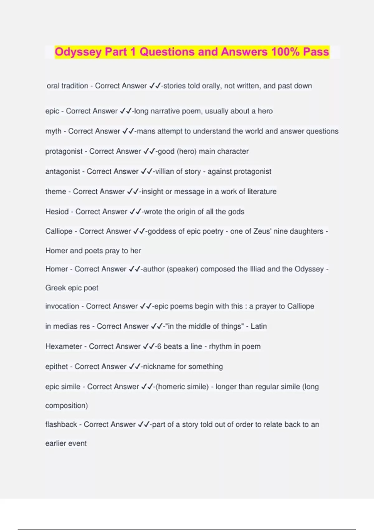 Odyssey Part 1 Questions and Answers 100% Pass oral tradition - Correct Answer ️️ -stories told orally, not written, and past down epic - Correct Answer ️️ -long narrative poem, usually about a hero myth - Correct Answer ️️ -mans attempt to understand the world and answer questions protagonist - Correct Answer ️️ -good (hero) main character antagonist - Correct Answer ️️ -villian of story - against protagonist theme - Correct Answer ️️ -insight or message in a work of literature Hesiod - Correct Answer ️️ -wrote the origin of all the gods Calliope - Correct Answer ️️ -goddess of epic poetry - one of Zeus' nine daughters - Homer and poets pray to her Homer - Correct Answer ️️ -author (speaker) composed the Illiad and the Odyssey - Greek epic poet invocation - Correct Answer ️️ -epic poems begin with this : a prayer to Calliope in medias res - Correct Answer ️️ -"in the middle of things" - Latin Hexameter - Correct Answer ️️ -6 beats a line - rhythm in poem epithet - Correct Answer ️️ -nickname for something epic simile - Correct Answer ️️ -(homeric simile) - longer than regular simile (long composition) flashback - Correct Answer ️️ -part of a story told out of order to relate back to an earlier event
