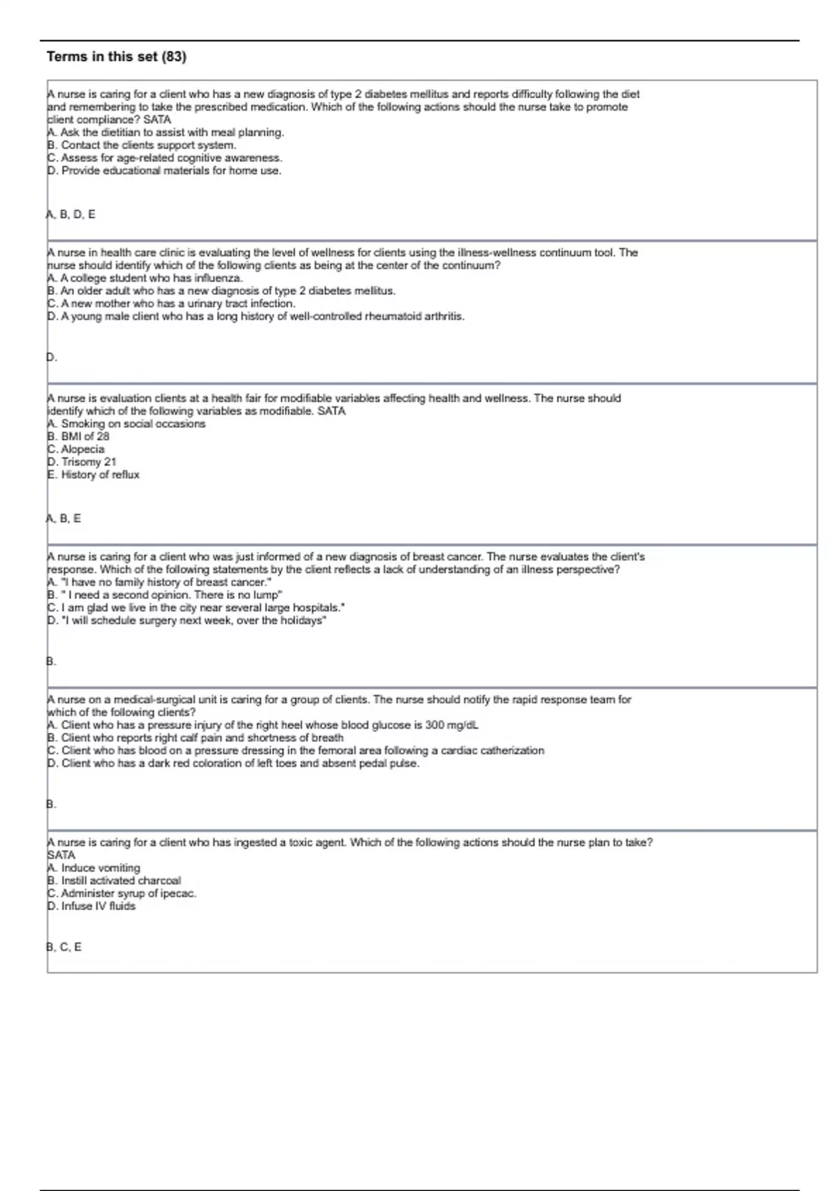 A nurse is caring for a client who has a new diagnosis of type 2 diabetes mellitus and reports difficulty following the diet and remembering to take the prescribed medication. Which of the following actions should the nurse take to promote client compliance? SATA A. Ask the dietitian to assist with meal planning. B. Contact the clients support system. C. Assess for age-related cognitive awareness. D. Provide educational materials for home use. A, B, D, E A nurse in health care clinic is evaluating the level of wellness for clients using the illness-wellness continuum tool. The nurse should identify which of the following clients as being at the center of the continuum? A. A college student who has influenza. B. An older adult who has a new diagnosis of type 2 diabetes mellitus. C. A new mother who has a urinary tract infection. D. A young male client who has a long history of well-controlled rheumatoid arthritis. D. A nurse is evaluation clients at a health fair for modifiable variables affecting health and wellness. The nurse should identify which of the following variables as modifiable. SATA A. Smoking on social occasions B. BMI of 28 C. Alopecia D. Trisomy 21 E. History of reflux A, B, E