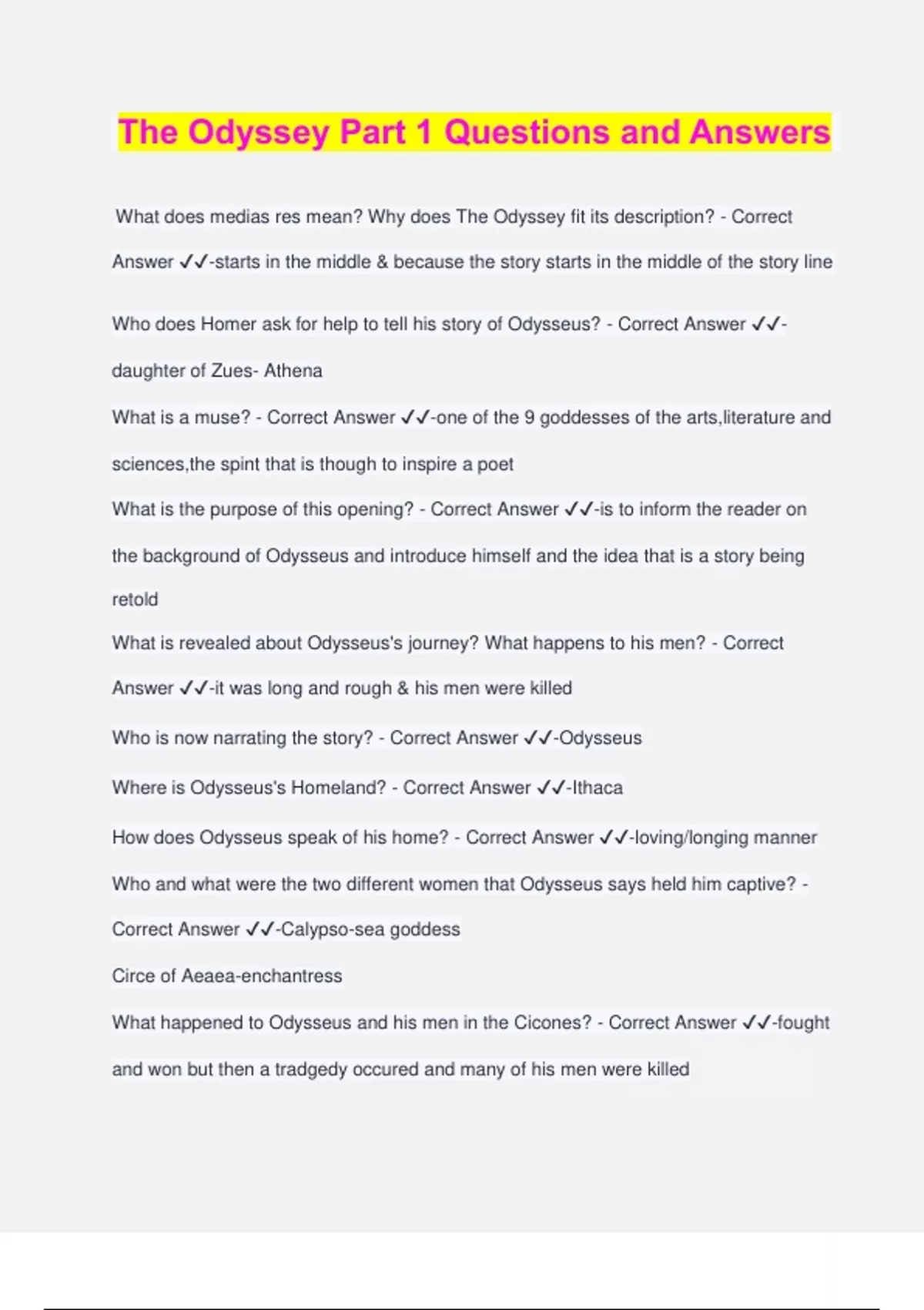 The Odyssey Part 1 Questions and Answers What does medias res mean? Why does The Odyssey fit its description? - Correct Answer ️️ -starts in the middle & because the story starts in the middle of the story line Who does Homer ask for help to tell his story of Odysseus? - Correct Answer ️️ - daughter of Zues- Athena What is a muse? - Correct Answer ️️ -one of the 9 goddesses of the arts,literature and sciences,the spint that is though to inspire a poet What is the purpose of this opening? - Correct Answer ️️ -is to inform the reader on the background of Odysseus and introduce himself and the idea that is a story being retold What is revealed about Odysseus's journey? What happens to his men? - Correct Answer ️️ -it was long and rough & his men were killed Who is now narrating the story? - Correct Answer ️️ -Odysseus Where is Odysseus's Homeland? - Correct Answer ️️ -Ithaca How does Odysseus speak of his home? - Correct Answer ️️ -loving/longing manner Who and what were the two different women that Odysseus says held him captive? - Correct Answer ️️ -Calypso-sea goddess Circe of Aeaea-enchantress What happened to Odysseus and his men in the Cicones? - Correct Answer ️️ -fought and won but then a tradgedy occured and many of his men were killed What threat did Odysseus and his men face before reaching the Island of the Lotus- Eaters? - Correct Answer ️️ -a storm How is the third arrival of dawn after the storm described?What image and feeling does that evoke? - Correct Answer ️️ -an opening to a new day with bring ringlets shining Who are the Lotus-Eaters? - Correct Answer ️️ -inhabitants of the island & home to Lotus flowers How do they pose a threat to Odysseus and his men? - Correct Answer ️️ -they charm people into staying on the island with extremely tasty flowers What issue does this episode reveal lies between Odysseu