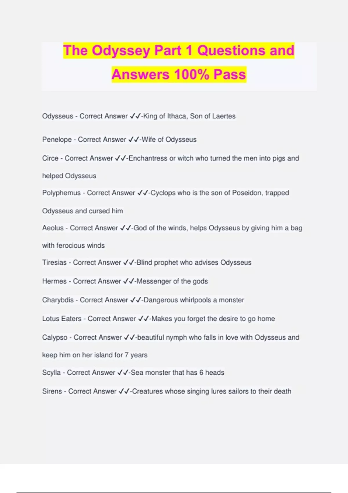 The Odyssey Part 1 Questions and Answers 100% Pass Odysseus - Correct Answer ️️ -King of Ithaca, Son of Laertes Penelope - Correct Answer ️️ -Wife of Odysseus Circe - Correct Answer ️️ -Enchantress or witch who turned the men into pigs and helped Odysseus Polyphemus - Correct Answer ️️ -Cyclops who is the son of Poseidon, trapped Odysseus and cursed him Aeolus - Correct Answer ️️ -God of the winds, helps Odysseus by giving him a bag with ferocious winds Tiresias - Correct Answer ️️ -Blind prophet who advises Odysseus Hermes - Correct Answer ️️ -Messenger of the gods Charybdis - Correct Answer ️️ -Dangerous whirlpools a monster Lotus Eaters - Correct Answer ️️ -Makes you forget the desire to go home Calypso - Correct Answer ️️ -beautiful nymph who falls in love with Odysseus and keep him on her island for 7 years Scylla - Correct Answer ️️ -Sea monster that has 6 heads Sirens - Correct Answer ️️ -Creatures whose singing lures sailors to their death