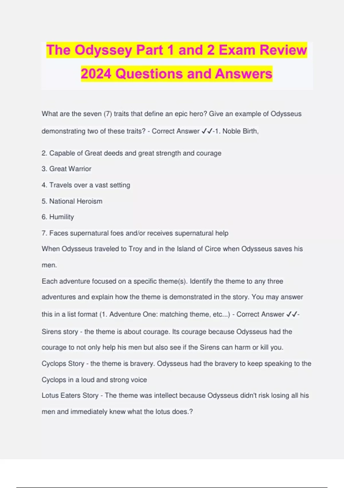 The Odyssey Part 1 and 2 Exam Review 2024 Questions and Answers What are the seven (7) traits that define an epic hero? Give an example of Odysseus demonstrating two of these traits? - Correct Answer ️️ -1. Noble Birth, 2. Capable of Great deeds and great strength and courage 3. Great Warrior 4. Travels over a vast setting 5. National Heroism 6. Humility 7. Faces supernatural foes and/or receives supernatural help When Odysseus traveled to Troy and in the Island of Circe when Odysseus saves his men. Each adventure focused on a specific theme(s). Identify the theme to any three adventures and explain how the theme is demonstrated in the story. You may answer this in a list format (1. Adventure One: matching theme, etc...) - Correct Answer ️️ - Sirens story - the theme is about courage. Its courage because Odysseus had the courage to not only help his men but also see if the Sirens can harm or kill you. Cyclops Story - the theme is bravery. Odysseus had the bravery to keep speaking to the Cyclops in a loud and strong voice Lotus Eaters Story - The theme was intellect because Odysseus didn't risk losing all his men and immediately knew what the lotus does.? How does Odysseus describe the Cyclops? How is this description connected to the Greek cultural values? - Correct Answer ️️ -Odysseus describes the Cyclops as a "horrid creature not like a human being at all," with a "loud voice and monstrous form." Polyphemus lives in a dirty cave, where he tends to his goats and sheep, a lifestyle that Odysseus and his warriors view as barbaric. Odysseus was not perfect. Discuss one of Odysseus' flaws and how they contributed to his journey being prolonged - Correct Answer ️️ -When Odysseus was leaving the cave of the Cyclops, he told the Cyclops his name which would later affect his journey back home with his men and crew mates from Polyphemus' curse. What literary device is demonstrated in the following passage, "Son of Laertes" - Correct Answer ️️ -Epithet What core Greek value is demonstrated in the following passage, "Then I sent out two picked men and a runner to learn what race of men that land sustained? - Correct Answer ️️ -Intelligence What occurs on the beach of the island of the Ciscones? - Correct Answer ️️ -The men slaughter the animals for a feast and the men fight all day long, into the night Which of the following best summarizes Odysseus' goal in the Odyssey? - Correct Answer ️️ -Fight to save his life and bring his shipmates home Part 1 of the Odyssey is mainly about Odysseus' - Correct Answer ️️ -Heroic deeds What form is the first few episodes told? - Correct Answer ️️ -Epic epithets Who is the antagonist in episode 3, The Cyclops? - Correct Answer ️️ -Polyphemus "Son of Laertes, Odysseus," is known as an _____? - Correct Answer ️️ -Epithet Which of the following actions of Odysseus makes him a good leader? - Correct Answer ️️ -On the island of the Lotus Eaters, he does not send all his men at once lest something bad happen He makes sure his men have wax in their ears when