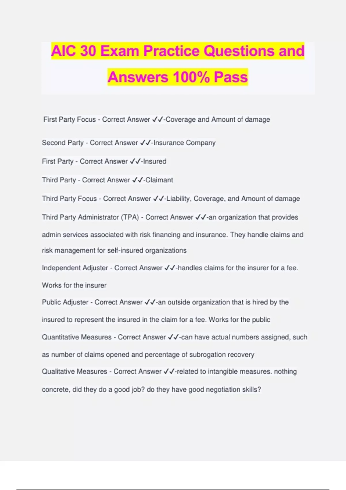 AIC 30 Exam Practice Questions and Answers 100% Pass First Party Focus - Correct Answer ️️ -Coverage and Amount of damage Second Party - Correct Answer ️️ -Insurance Company First Party - Correct Answer ️️ -Insured Third Party - Correct Answer ️️ -Claimant Third Party Focus - Correct Answer ️️ -Liability, Coverage, and Amount of damage Third Party Administrator (TPA) - Correct Answer ️️ -an organization that provides admin services associated with risk financing and insurance. They handle claims and risk management for self-insured organizations Independent Adjuster - Correct Answer ️️ -handles claims for the insurer for a fee. Works for the insurer Public Adjuster - Correct Answer ️️ -an outside organization that is hired by the insured to represent the insured in the claim for a fee. Works for the public Quantitative Measures - Correct Answer ️️ -can have actual numbers assigned, such as number of claims opened and percentage of subrogation recovery Qualitative Measures - Correct Answer ️️ -related to intangible measures. nothing concrete, did they do a good job? do they have good negotiation skills? Ethics - Correct Answer ️️ -the study of what constitutes good and bad behavior, dealing with the moral duty and obligation Conflict of Interest - Correct Answer ️️ -a situation that occurs when a decision makers personal interests interfere to the extent that he/she makes decisions that adversely affect the customer, claimant, or employer Ex Parte Contract - Correct Answer ️️ -contracts in which only 1 party is heard. discussing the claim with the represented person without benefit of their attorney being involved. this is not illegal, but its not ethical. Fraud - Correct Answer ️️ -an intentional misrepresentation resulting in harm to another person or organization Code of Ethics - Correct Answer ️️ -professional guidelines of behavior within an organization or profession N.A.I.C - Correct Answer ️️ -The National Association of Insur