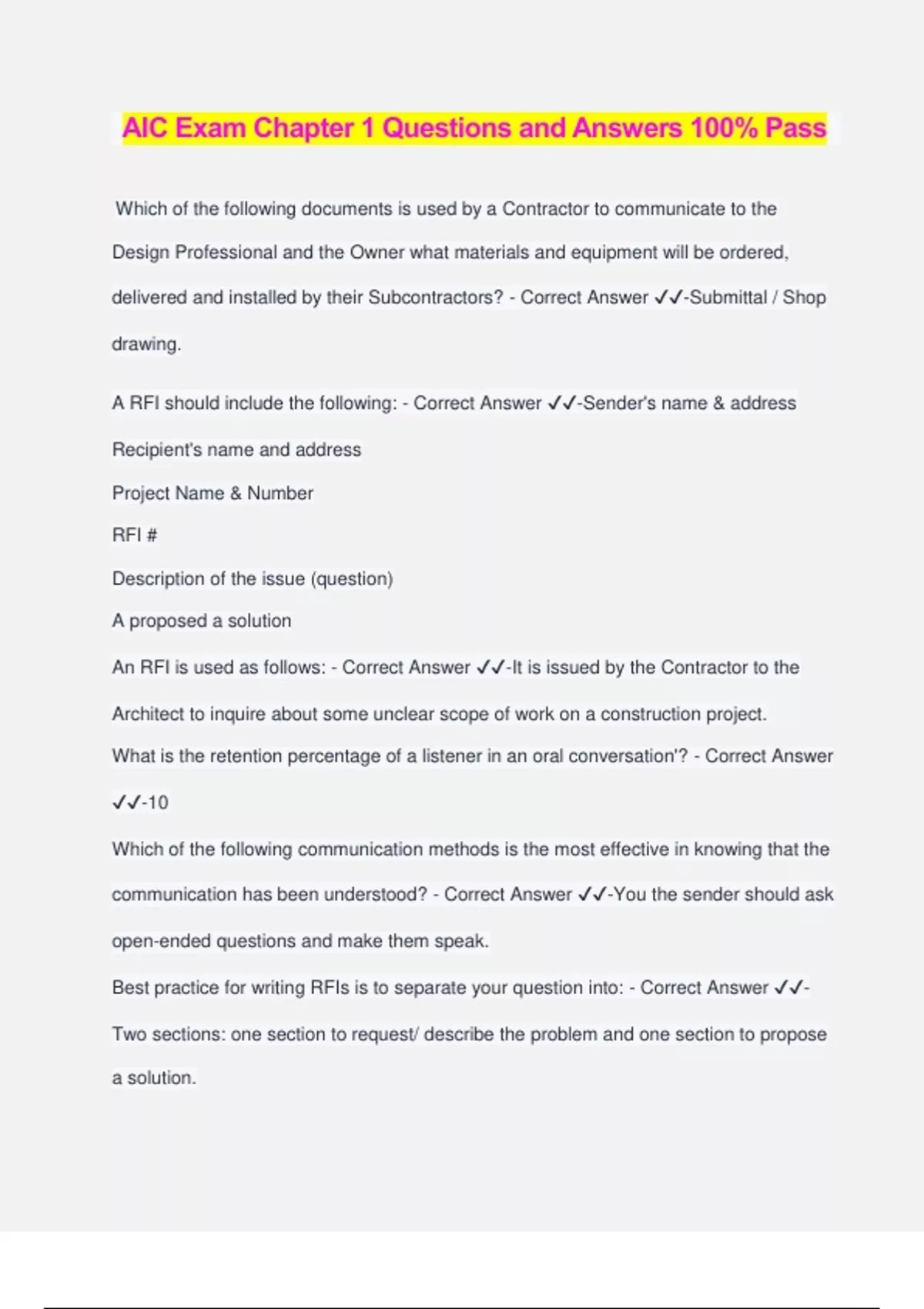 AIC Exam Chapter 1 Questions and Answers 100% Pass Which of the following documents is used by a Contractor to communicate to the Design Professional and the Owner what materials and equipment will be ordered, delivered and installed by their Subcontractors? - Correct Answer ️️ -Submittal / Shop drawing. A RFI should include the following: - Correct Answer ️️ -Sender's name & address Recipient's name and address Project Name & Number RFI # Description of the issue (question) A proposed a solution An RFI is used as follows: - Correct Answer ️️ -It is issued by the Contractor to the Architect to inquire about some unclear scope of work on a construction project. What is the retention percentage of a listener in an oral conversation'? - Correct Answer ️️ -10 Which of the following communication methods is the most effective in knowing that the communication has been understood? - Correct Answer ️️ -You the sender should ask open-ended questions and make them speak. Best practice for writing RFIs is to separate your question into: - Correct Answer ️️ - Two sections: one section to request/ describe the problem and one section to propose a solution. What are the leadership skills needed to conduct a productive meeting? - Correct Answer ️️ -Listening Attentively, Responding Constructively. Soliciting All Ideas, and Matching Decision Making to the Situation. What is the best time to distribute the Meeting Minutes to the Participants? - Correct Answer ️️ -About one day after the meeting