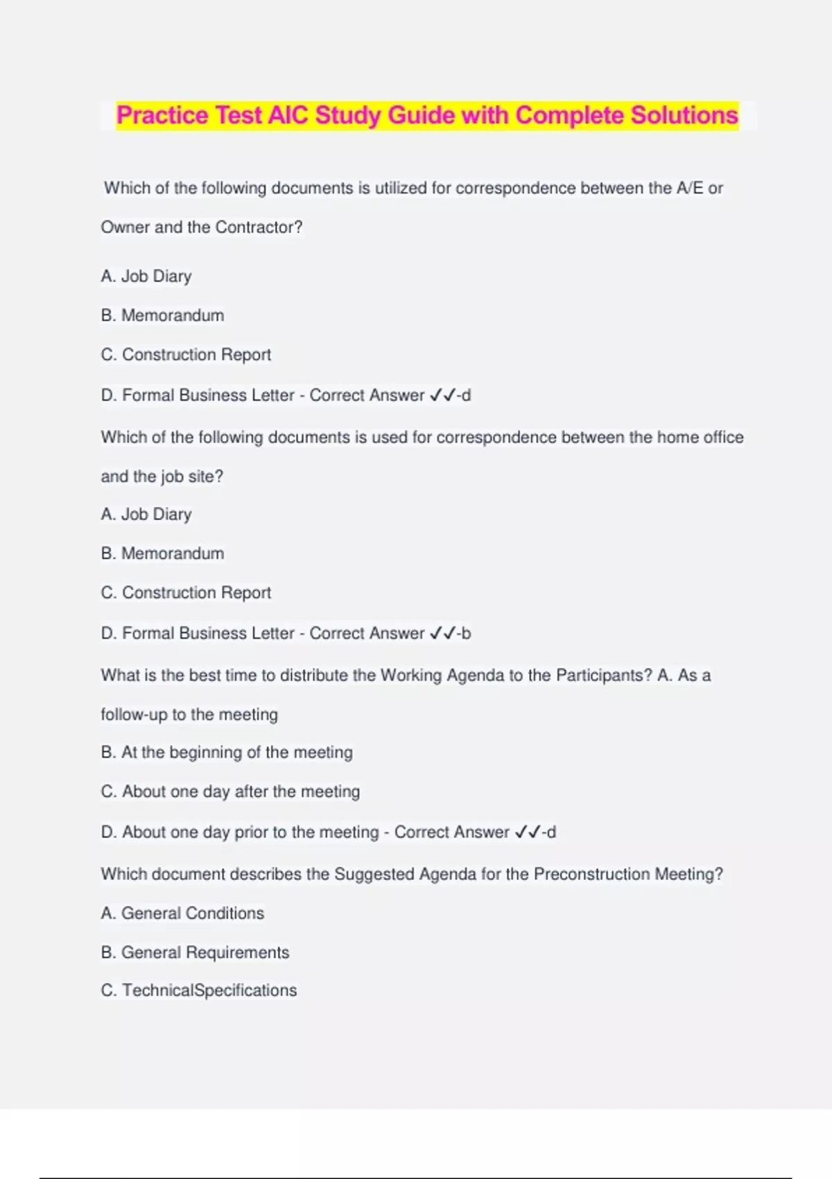 Practice Test AIC Study Guide with Complete Solutions Which of the following documents is utilized for correspondence between the A/E or Owner and the Contractor? A. Job Diary B. Memorandum C. Construction Report D. Formal Business Letter - Correct Answer ️️ -d Which of the following documents is used for correspondence between the home office and the job site? A. Job Diary B. Memorandum C. Construction Report D. Formal Business Letter - Correct Answer ️️ -b What is the best time to distribute the Working Agenda to the Participants? A. As a follow-up to the meeting B. At the beginning of the meeting C. About one day after the meeting D. About one day prior to the meeting - Correct Answer ️️ -d Which document describes the Suggested Agenda for the Preconstruction Meeting? A. General Conditions B. General Requirements C. TechnicalSpecifications D. Supplementary Conditions - Correct Answer ️️ -b What is the best time to distribute the Meeting Minutes to the Participants? A. At the beginning of the meeting B. About one day after the meeting C. About one hour prior to the meeting D. About one day prior to the meeting - Correct Answer ️️ -b Which of the following descriptions are the primary content items for the meeting minutes? A. To, from, project, date, time place and subject B. Purpose, specific objectives, time frame, topical headings with paragraph, role C. Objective clear and measurable, attendance, role of each person, their expertise D. Attendance, topical headings with paragraph stating person assigned, completion - Correct Answer ️️ -d Which of the following descriptions are the content items for the working agenda? A. Plan with goals and specific activities, priority, time needed, scheduled events B. Purpose, specific objectives, time frame, topical headings with paragraph, role C. Activity description, days, information needed crew size, material & equipment D. Attendance, topical headings with paragraph stating person assigned, completion - Correct Answer ️️ -b What are the mental activities that must be taken into consideration for each topic during the planning phase of a meeting? A. Coordinating, Listening Attentively, Responding Critically, and Soliciting Ideas B. Planning, Timing, Coordinating, Probing, Responding Critically, and Follow-up C. Goals, Gathering, Problem Solving, Decision Making, Action Plan & Monitoring D. Goals, Planning, Scheduling, Priorities, Analyzing, Delegating, and Monitoring - Correct Answer ️️ -c What are the leadership skills needed to conduct a productive meeting? A. Planning, Probing Questions, Responding Critically, and Decision Making B. Planning, Timing, Coordinating, Probing, Responding Critically, and Follow-up C. Listening Attentively, Responding Constructively, Soliciting All Ideas, and Matching Decision Making to the Situation D. Coordinating, Listening Selectively, Responding Critically, Soliciting Supportive Ideas and Adjusting Decision Making to the Situation - Correct Answer ️️ -c Which one of the following is transferred from one mind to another? A. Words B. Meaning C. Information D. Understanding - Correct Answer ️️ -a What is the retention percentage of a listener in an oral conversation? A. 10% B. 20% C. 50% D. 90% - Correct Answer ️️ -a Which of the following communication methods is the most effective in knowing that the communication has been understood? A. You the sender should ask closed ended