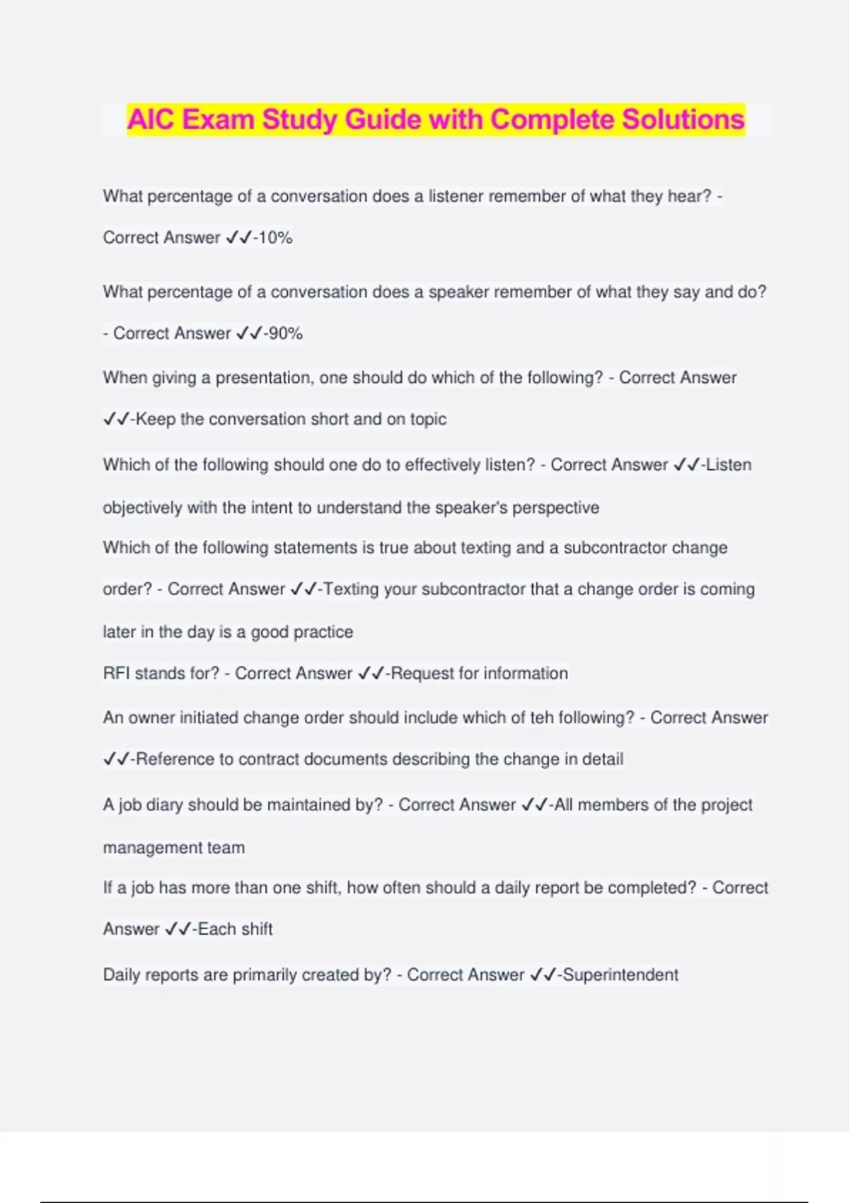 AIC Exam Study Guide with Complete Solutions What percentage of a conversation does a listener remember of what they hear? - Correct Answer ️️ -10% What percentage of a conversation does a speaker remember of what they say and do? - Correct Answer ️️ -90% When giving a presentation, one should do which of the following? - Correct Answer ️️ -Keep the conversation short and on topic Which of the following should one do to effectively listen? - Correct Answer ️️ -Listen objectively with the intent to understand the speaker's perspective Which of the following statements is true about texting and a subcontractor change order? - Correct Answer ️️ -Texting your subcontractor that a change order is coming later in the day is a good practice RFI stands for? - Correct Answer ️️ -Request for information An owner initiated change order should include which of teh following? - Correct Answer ️️ -Reference to contract documents describing the change in detail A job diary should be maintained by? - Correct Answer ️️ -All members of the project management team If a job has more than one shift, how often should a daily report be completed? - Correct Answer ️️ -Each shift Daily reports are primarily created by? - Correct Answer ️️ -Superintendent Meeting agendas should be distributed ___. - Correct Answer ️️ -At least one day prior to the meeting Meeting minutes should be distributed ___. - Correct Answer ️️ -About one day after the meeting Which of the following types of meetings is typically held at regular weekly or bi-weekly intervals throughout the project? - Correct Answer ️️ -progress meetings Which material is prone to fire damage and deterioration by moisture and insects? - Correct Answer ️️ -Wood Concrete is strongest in ___? - Correct Answer ️️ -Compressive strength Which of the following is a type of aggregate? - Correct Answer ️️ -gravel Approximately what percentage (by volume) does aggregate make up in concrete? - Correct Answer ️️ -75% What does a sieve size of No. 4 mean? - Correct Answer ️️ -the sieve has 4 openings per lineal inch Which panel wood product is made up of thin layers of wood veneers adhered together in alternating directions? - Correct Answer ️️ -plywood the "10" in a W10x30 steel beam indicates? - Correct Answer ️️ -The nominal depth of the beam in inches Which of the following mortar types has the highest strength? - Correct Answer ️️ - Type M Which of the following is a type of deep foundation? - Correct Answer ️️ -Caisson Clay is what type of soil? - Correct Answer ️️ -Cohesive soil Sand is what type of soil? - Correct Answer ️️ -Cohesionless soil Soil that has been excavated and stockpiled is considered to be in a ___ state? - Correct Answer ️️ -Loose What is the purpose of a visual field soil analysis? - Correct Answer ️️ -Establish general soil classifications What is the correct order of subsurface soil exploration? - Correct Answer ️️ -boring, sampling, testing Fine-grained soils are soils finer than a ___? - Correct Answer ️️ -No. 200 sieve Referencing the sample boring log in figure 2-7, at approximately what depth would you expect to find very stiff gray sandy clay? - Correct Answer ️️ -20-24 feet Wood, steel and rigid insulation are all used for ___? - Correct Answer ️️ -concrete formwork Deflection is a result of what type of stress? - Corre