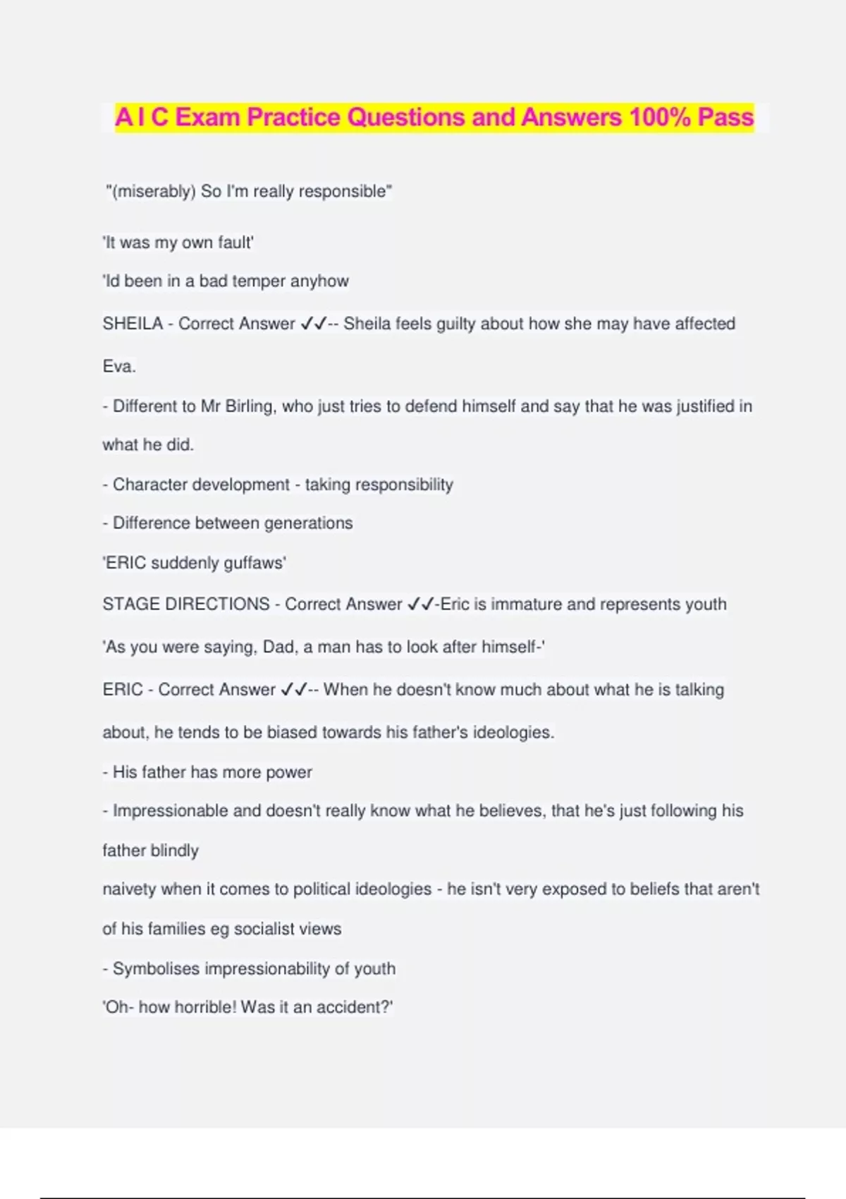 A I C Exam Practice Questions and Answers 100% Pass "(miserably) So I'm really responsible" 'It was my own fault' 'Id been in a bad temper anyhow SHEILA - Correct Answer ️️ -- Sheila feels guilty about how she may have affected Eva. - Different to Mr Birling, who just tries to defend himself and say that he was justified in what he did. - Character development - taking responsibility - Difference between generations 'ERIC suddenly guffaws' STAGE DIRECTIONS - Correct Answer ️️ -Eric is immature and represents youth 'As you were saying, Dad, a man has to look after himself-' ERIC - Correct Answer ️️ -- When he doesn't know much about what he is talking about, he tends to be biased towards his father's ideologies. - His father has more power - Impressionable and doesn't really know what he believes, that he's just following his father blindly naivety when it comes to political ideologies - he isn't very exposed to beliefs that aren't of his families eg socialist views - Symbolises impressionability of youth 'Oh- how horrible! Was it an accident?' SHEILA ''Well don't tell me that's because I discharged her from my employment nearly two years ago' BIRLING - Correct Answer ️️ -Sheila represents youth whereas Birling symbolises old beliefs 'But these girls aren't cheap labour - they're people' SHEILA TO INSPECTOR - Correct Answer ️️ -- Possible naivety of youth - New ideologies contrasting with Birling's - Social responsibility and morality Mr Birling reflects the typical patronising male view of woman in 1912 - Correct Answer ️️ -"...not only something to make 'em look prettier - but - well, a sort of sign or token of their self-respect." Gerald makes sexist and superficial comments about the women in the bar he visits. - Correct Answer ️️ -"I hate those hard-eyed dough-faced women." Mrs. Birling also shows that women of the time could be old-fashioned and cruel as men - Correct Answer ️️ -"She was claiming elaborate fine feelings and scruples that were simply absurd in a girl in her position." Turn taking theory applied to theme of gender roles - Correct Answer ️️ -The male characters eg Mr Birling typically speak for longer periods of time and more frequently Proleptic Irony - Correct Answer ️️ -When something is foreshadowed and comes to fruition at a later stage in the novel/play, etc. It is basically foreshadowing. This happens at the end of the play when the phone again rings to continue the cycle Economic Power - Correct Answer ️️ -Disparity between