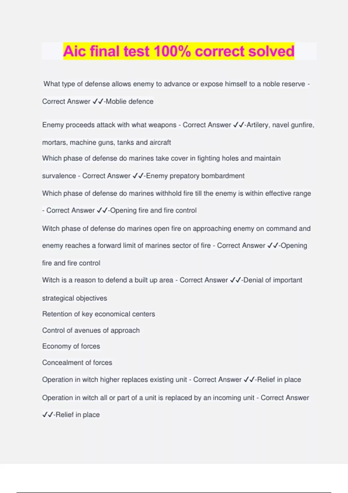 Aic final test 100% correct solved What type of defense allows enemy to advance or expose himself to a noble reserve - Correct Answer ️️ -Moblie defence Enemy proceeds attack with what weapons - Correct Answer ️️ -Artilery, navel gunfire, mortars, machine guns, tanks and aircraft Which phase of defense do marines take cover in fighting holes and maintain survalence - Correct Answer ️️ -Enemy prepatory bombardment Which phase of defense do marines withhold fire till the enemy is within effective range - Correct Answer ️️ -Opening fire and fire control Witch phase of defense do marines open fire on approaching enemy on command and enemy reaches a forward limit of marines sector of fire - Correct Answer ️️ -Opening fire and fire control Witch is a reason to defend a built up area - Correct Answer ️️ -Denial of important strategical objectives Retention of key economical centers Control of avenues of approach Economy of forces Concealment of forces Operation in witch higher replaces existing unit - Correct Answer ️️ -Relief in place Operation in witch all or part of a unit is replaced by an incoming unit - Correct Answer ️️ -Relief in place Variation of an area defense that can meat attack in all directions - Correct Answer ️️ - Perimeter defence Defence organized on terrain to mask from indirect fire weapons - Correct Answer ️️ - Defense in reverse slope/ reverse slope defense Offensive rifle squad emplacement that covers the advance element of menuver element by engaging all targets - Correct Answer ️️ -Point of advance guard 9 fundamentals of defense - Correct Answer ️️ -Proper utiliz