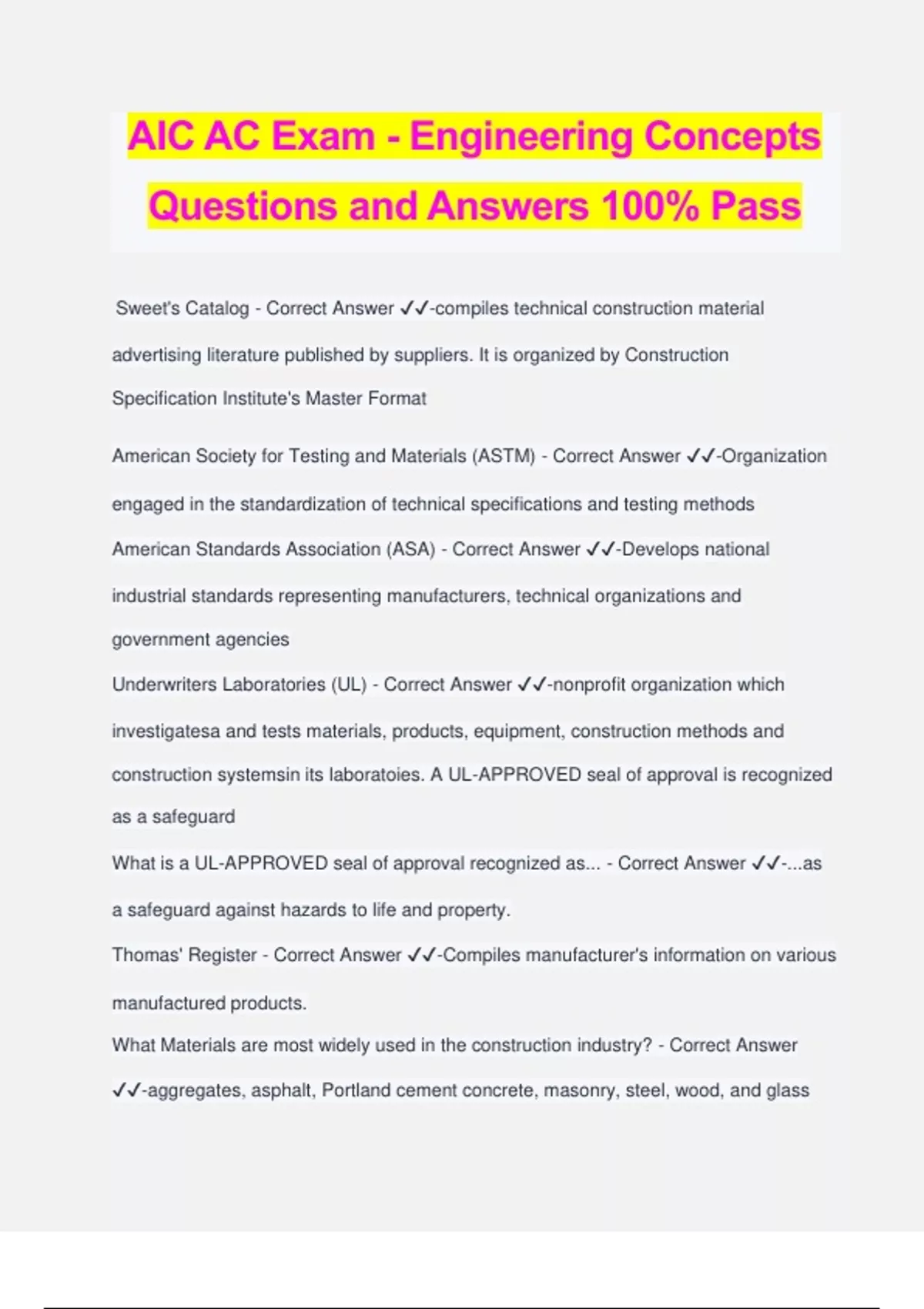 AIC AC Exam - Engineering Concepts Questions and Answers 100% Pass Sweet's Catalog - Correct Answer ️️ -compiles technical construction material advertising literature published by suppliers. It is organized by Construction Specification Institute's Master Format American Society for Testing and Materials (ASTM) - Correct Answer ️️ -Organization engaged in the standardization of technical specifications and testing methods American Standards Association (ASA) - Correct Answer ️️ -Develops national industrial standards representing manufacturers, technical organizations and government agencies Underwriters Laboratories (UL) - Correct Answer ️️ -nonprofit organization which investigatesa and tests materials, products, equipment, construction methods and construction systemsin its laboratoies. A UL-APPROVED seal of approval is recognized as a safeguard What is a UL-APPROVED seal of approval recognized as... - Correct Answer ️️ -...as a safeguard against hazards to life and property. Thomas' Register - Correct Answer ️️ -Compiles manufacturer's information on various manufactured products. What Materials are most widely used in the construction industry? - Correct Answer ️️ -aggregates, asphalt, Portland cement concrete, masonry, steel, wood, and glass Aggregates - Correct Answer ️️ -particles of random shape and size that are found in nature, such as, sand, gravel, or rock that can be crushed. Size can vary from several inches to the smallest grain of sand. Smaller than a grain of sand is considered an impurity What are aggregates used for? - Correct Answer ️️ -as bases placed on top of the soil to uniformly distribute the lod over the soil for a footing or road. Riprap - Correct Answer ️️ -placed at the end of culverts or along the edge of a body of water to prevent erosion. Soundness of aggregate - Correct Answer ️️ -aggregate quality of resisting weathering Permeability - Correct Answer ️️ -the measure of the ease with which water will flow through an aggregates voids. High permeability is needed if the aggregate is used as a filter or drain Gradation - Correct Answer ️️ -distribution within the range covered. Well-graded - Correct Answer ️️ -sizes of particles within the entire range are in approximately equal amounts Poorly-graded - Correct Answer ️️ -sizes of particles widely vary Uniform Gradation - Correct Answer ️️ -a large percentage of the particles are of approximately the same size. Gap graded - Correct Answer ️️ -most of the particles are of a large size or a small size with very few particles of an intermediate size. Sieve analysis - Correct Answer ️️ -normally graphed using the percentage retained for each gradation level and plotted on a gradation curve. The shape of the curve provides visual help in identifying the type of gradation. A vertical or nearly vertical line indicates that a large quantity of material is retained on one or possibly two sieves indicating a Uniform gradation. A line with a constant slope indicates that approximately