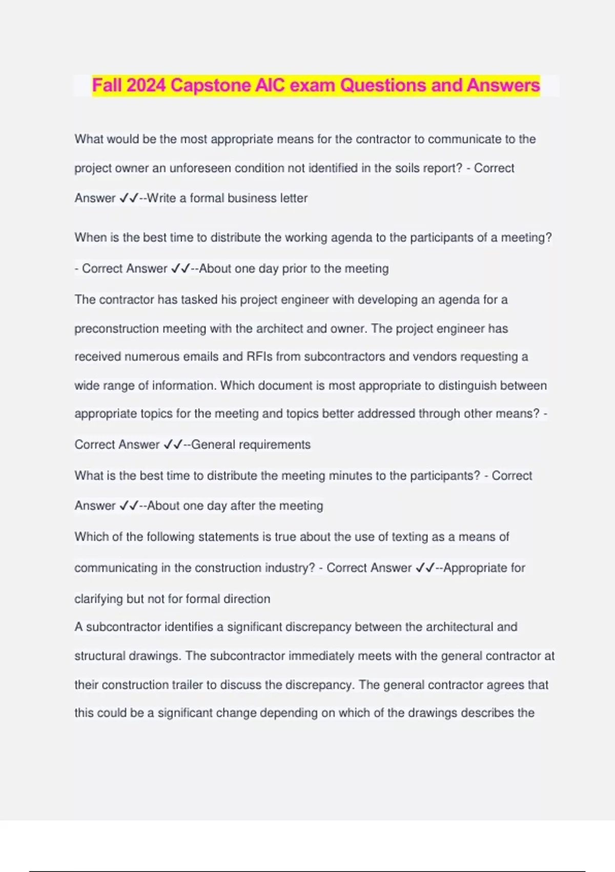 Fall 2024 Capstone AIC exam Questions and Answers What would be the most appropriate means for the contractor to communicate to the project owner an unforeseen condition not identified in the soils report? - Correct Answer ️️ --Write a formal business letter When is the best time to distribute the working agenda to the participants of a meeting? - Correct Answer ️️ --About one day prior to the meeting The contractor has tasked his project engineer with developing an agenda for a preconstruction meeting with the architect and owner. The project engineer has received numerous emails and RFIs from subcontractors and vendors requesting a wide range of information. Which document is most appropriate to distinguish between appropriate topics for the meeting and topics better addressed through other means? - Correct Answer ️️ --General requirements What is the best time to distribute the meeting minutes to the participants? - Correct Answer ️️ --About one day after the meeting Which of the following statements is true about the use of texting as a means of communicating in the construction industry? - Correct Answer ️️ --Appropriate for clarifying but not for formal direction A subcontractor identifies a significant discrepancy between the architectural and structural drawings. The subcontractor immediately meets with the general contractor at their construction trailer to discuss the discrepancy. The general contractor agrees that this could be a significant change depending on which of the drawings describes the designer's intent. Which of the following actions is the most appropriate in this situation? - Correct Answer ️️ --Draft an RFI that describes the discrepancy in detail and submit it to the architect immediately. What are the leadership skills needed to conduct a productive meeting? - Correct Answer ️️ -Listening attentively, responding constructively, soliciting all ideas, and matching decision making to the situation Which of the following statements made by the indicated parties below would least likely be made at an owner/architect/contractor progress meeting? - Correct Answer ️️ - Project manager: "The bond rate for ABC subcontractor is 1.45%" What is a listener's retention percentage of an oral conversation? - Correct Answer ️️ - 10% Which of the following communication methods is the most effective way to know that the communication has been understood? - Correct Answer ️️ -The sender should ask open-ended questions and make them speak . Which of the following is the best example of an open-ended question? - Correct Answer ️️ -What steps are you going to take to complete the activity? Which of the following statements about the following organizations and their justifications of its use is most appropriate when designers develop project specifications? - Correct Answer ️️ -Use the Construction Specification Institute's organizational system for categorizing construction materials into divisions and sections as it is widely used by the industry. Assume you have a simple beam 16 ft long supported on each end by R1 and R2. There is a concentrated load of 900 lb that is 4 ft from R2. Reaction R1 is pinned 12 ft from the load. Reaction R1 is 225 lb and R2 is 675 lb. What is the maximum bending moment in pounds per foot? - Correct Answer ️️ -2,700 Assume that you are pouring a wall that is 151 ft 4 in. long, 14 ft high and, 1 ft 4 in. thick. The crew's daily placement rate is 375 cy per 8-hr day. How many hours will it take to complete the wall? - Correct Answer ️️ -2.2 (151.33ft X 14ft X 1.33FT) X (1cy/27cft)=104.6cy 375cy/8hr=46.9hr/cy=2.2 hr Using the average soil weights from the table fig. 1,