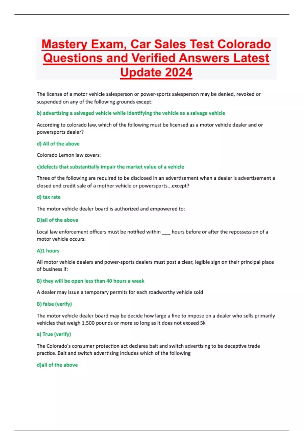 Mastery Exam, Car Sales Test Colorado Questions and Verified Answers Latest Update 2024