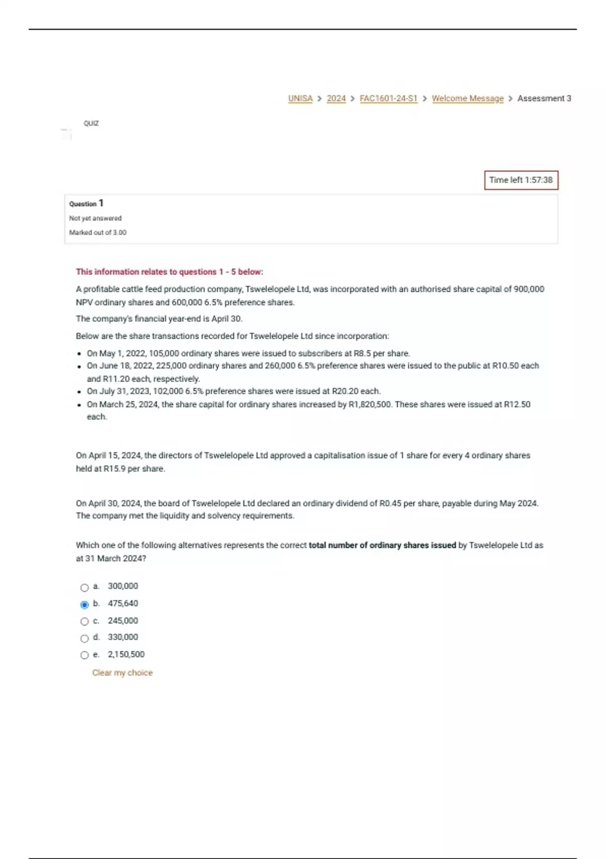 A profitable cattle feed production company, Tswelelopele Ltd, was incorporated with an authorised share capital of 900,000