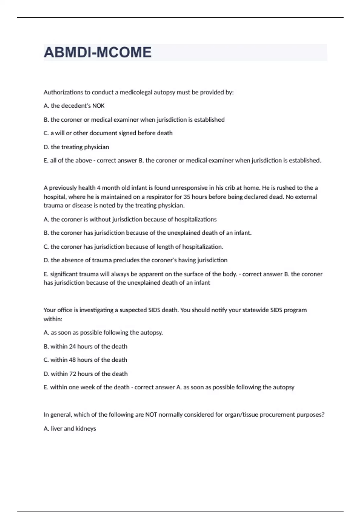 ABMDI-MCOME Questions with complete solution 2024 ABMDI-MCOME Authorizations to conduct a medicolegal autopsy must be provided by: A. the decedent's NOK B. the coroner or medical examiner when jurisdiction is established C. a will or other document signed before death D. the treating physician E. all of the above - correct answer B. the coroner or medical examiner when jurisdiction is established. A previously health 4 month old infant is found unresponsive in his crib at home. He is rushed to the a hospital, where he is maintained on a respirator for 35 hours before being declared dead. No external trauma or disease is noted by the treating physician. A. the coroner is without jurisdiction because of hospitalizations B. the coroner has jurisdiction because of the unexplained death of an infant. C. the coroner has jurisdiction because of length of hospitalization. D. the absence of trauma precludes the coroner's having jurisdiction E. significant trauma will always be apparent on the surface of the body. - correct answer B. the coroner has jurisdiction because of the unexplained death of an infant Your office is investigating a suspected SIDS death. You should notify your statewide SIDS program within: A. as soon as possible following the autopsy. B. within 24 hours of the death C. within 48 hours of the death D. within 72 hours of the death