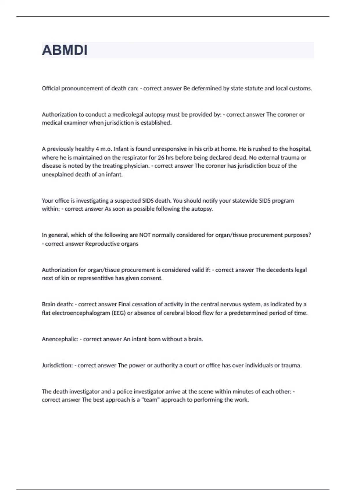ABMDI Question and answers 100% correct 2024 ABMDI Official pronouncement of death can: - correct answer Be defermined by state statute and local customs. Authorization to conduct a medicolegal autopsy must be provided by: - correct answer The coroner or medical examiner when jurisdiction is established. A previously healthy 4 m.o. Infant is found unresponsive in his crib at home. He is rushed to the hospital, where he is maintained on the respirator for 26 hrs before being declared dead. No external trauma or disease is noted by the treating physician. - correct answer The coroner has jurisdiction bcuz of the unexplained death of an infant. Your office is investigating a suspected SIDS death. You should notify your statewide SIDS program within: - correct answer As soon as possible following the autopsy. In general, which of the following are NOT normally considered for organ/tissue procurement purposes? - correct answer Reproductive organs Authorization for organ/tissue procurement is considered valid if: - correct answer The decedents legal next of kin or representitive has given consent.