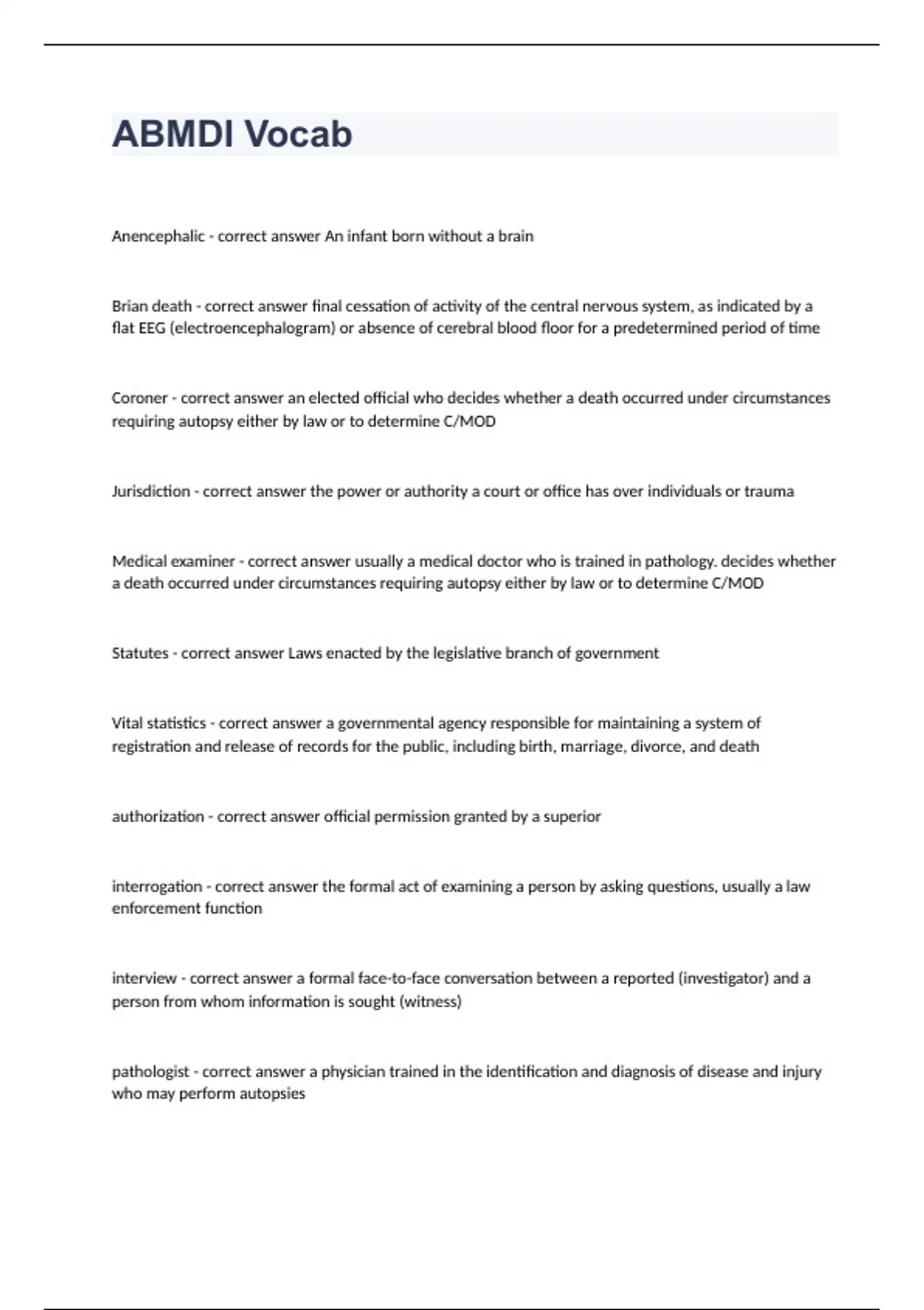 ABMDI Vocab Question and answers already passed 2024 ABMDI Vocab Anencephalic - correct answer An infant born without a brain Brian death - correct answer final cessation of activity of the central nervous system, as indicated by a flat EEG (electroencephalogram) or absence of cerebral blood floor for a predetermined period of time Coroner - correct answer an elected official who decides whether a death occurred under circumstances requiring autopsy either by law or to determine C/MOD Jurisdiction - correct answer the power or authority a court or office has over individuals or trauma Medical examiner - correct answer usually a medical doctor who is trained in pathology. decides whether a death occurred under circumstances requiring autopsy either by law or to determine C/MOD Statutes - correct answer Laws enacted by the legislative branch of government Vital statistics - correct answer a governmental agency responsible for maintaining a system of registration and release of records for the public, including birth, marriage, divorce, and death authorization - correct answer official permission granted by a superior interrogation - correct answer th