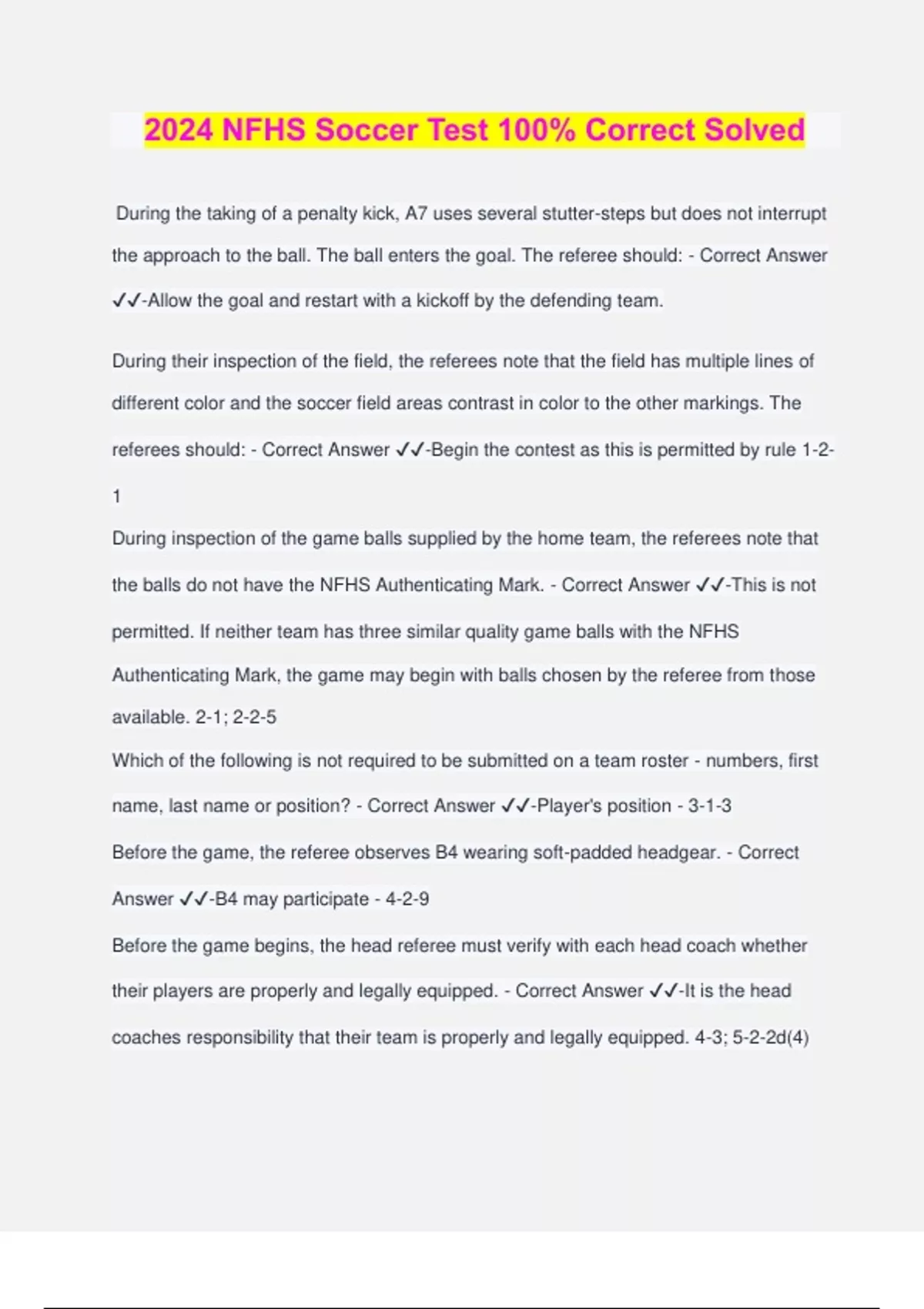 2024 NFHS Soccer Test 100% Correct Solved During the taking of a penalty kick, A7 uses several stutter-steps but does not interrupt the approach to the ball. The ball enters the goal. The referee should: - Correct Answer ️️ -Allow the goal and restart with a kickoff by the defending team. During their inspection of the field, the referees note that the field has multiple lines of different color and the soccer field areas contrast in color to the other markings. The referees should: - Correct Answer ️️ -Begin the contest as this is permitted by rule 1-2- 1 During inspection of the game balls supplied by the home team, the referees note that the balls do not have the NFHS Authenticating Mark. - Correct Answer ️️ -This is not permitted. If neither team has three similar quality game balls with the NFHS Authenticating Mark, the game may begin with balls chosen by the referee from those available. 2-1; 2-2-5 Which of the following is not required to be submitted on a team roster - numbers, first name, last name or position? - Correct Answer ️️ -Player's position - 3-1-3 Before the game, the referee observes B4 wearing soft-padded headgear. - Correct Answer ️️ -B4 may participate - 4-2-9 Before the game begins, the head referee must verify with each head coach whether their players are properly and legally equipped. - Correct Answer ️️ -It is the head coaches responsibility that their team is properly and legally equipped. 4-3; 5-2-2d(4) Before the game, the Team A head coach informs the referee that A15 will be wearing a hockey-style mask, due to an injury she received in a game the previous week. - Correct Answer ️️ -This is not permitted. 4-2-8; 4.2.1 Situation G 8. During the pregame inspection, the official notes that the visiting team's players are wearing white socks with visible black electrical tape around the top of their socks in honor of a schoolmate who has died. The official should: - Correct Answer ️️ -Not permit players with black tape to play until it is corrected. - 4-1-1b It is recommended that substitutes: - Correct Answer ️️ -Wear distinguishing pinnies when warming up outside the team area. - 4-1-3 The goalkeeper must have a number on the back of the jersey and on the front of the jersey or pants. - Correct Answer ️️ -This is required. - 4-1-1h(1) The home team and the visiting team are both wearing blue shorts. - Correct Answer ️️ -This is permitted. - 4-1-1a The visiting team arrives at the game site wearing white uniform tops and yellow socks. - Correct Answer ️️ -The visiting team should change to white socks. If unable to correct, the game shall be played and the referee must notify the state association following the game. - 4.1.1 Situation G An identifiable supporter of the home team seated in the designated spectator area is screaming profanities at the nearest assistant referee in disagreement with a decision about offside made by the assistant referee. The referee should: - Correct Answer ️️ - Stop play and request that the home school administration take appropriate action. - 5- 3-2e B14 takes a shot on goal, with goalkeeper A1 out of position. A3, however, extends her arm into the path of the ball, deflecting it to B9. B9 shoots and the ball enters the goal. - Correct Answer ️️ -The referee should allow the goal and caution A3 for unsporting conduct. - 5.3.1 Situation A; 12-8-1f Team B's head coach receives a second caution and is disqualified. The referee shall: - Correct Answer ️️ -Display the yellow card indicating the subsequent caution immediately followed by a red card. - 5-3-1g Since there is no visible clock available at the game site, the referee shall: - Correct Answer ️️ -Keep the official time on his or her watch and shall stop and start the watch at the times specified in Rule 6-2-3a. - 5-3-2f; 6-2-1; 6-2-3a The ball goes directly into the opponent's goal from a corner kick. The referee should: - Correct Answer ️️ -Allow the goal. - 10-1-2e