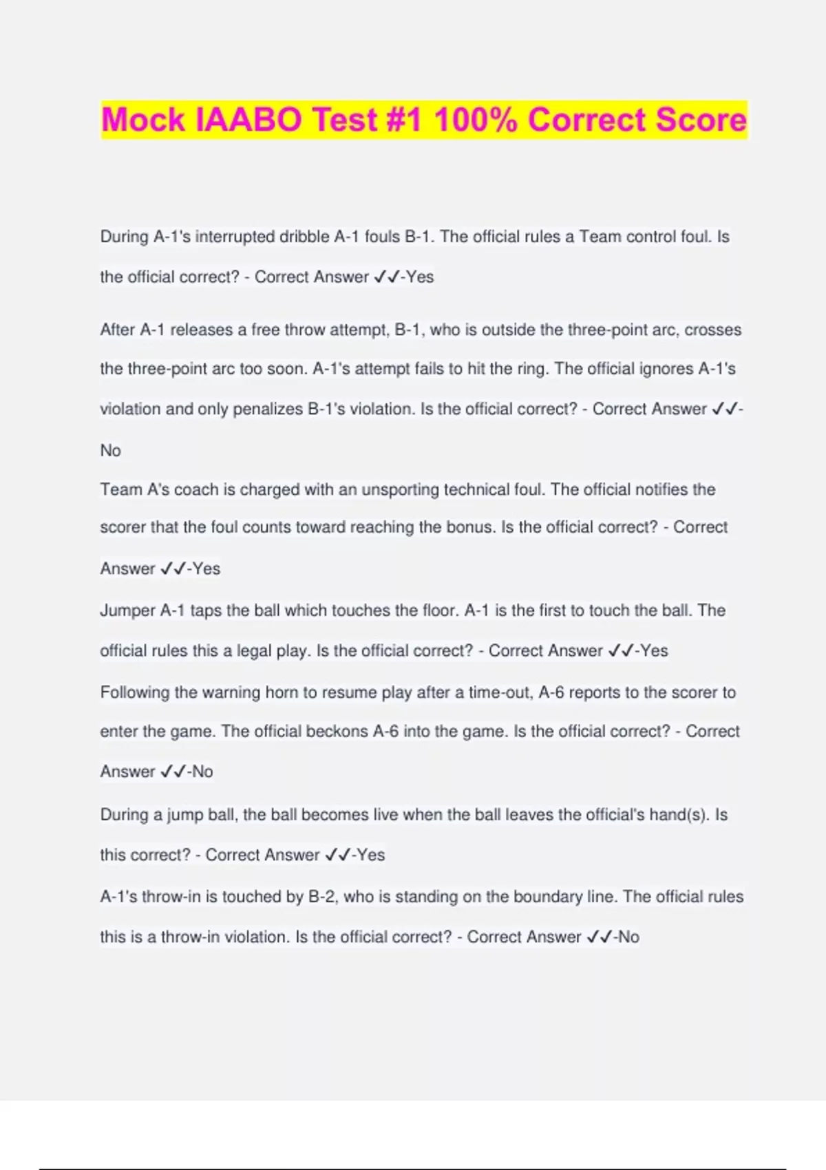 Mock IAABO Test #1 100% Correct Score During A-1's interrupted dribble A-1 fouls B-1. The official rules a Team control foul. Is the official correct? - Correct Answer ️️ -Yes After A-1 releases a free throw attempt, B-1, who is outside the three-point arc, crosses the three-point arc too soon. A-1's attempt fails to hit the ring. The official ignores A-1's violation and only penalizes B-1's violation. Is the official correct? - Correct Answer ️️ - No Team A's coach is charged with an unsporting technical foul. The official notifies the scorer that the foul counts toward reaching the bonus. Is the official correct? - Correct Answer ️️ -Yes Jumper A-1 taps the ball which touches the floor. A-1 is the first to touch the ball. The official rules this a legal play. Is the official correct? - Correct Answer ️️ -Yes Following the warning horn to resume play after a time-out, A-6 reports to the scorer to enter the game. The official beckons A-6 into the game. Is the official correct? - Correct Answer ️️ -No During a jump ball, the ball becomes live when the ball leaves the official's hand(s). Is this correct? - Correct Answer ️️ -Yes A-1's throw-in is touched by B-2, who is standing on the boundary line. The official rules this is a throw-in violation. Is the official correct? - Correct Answer ️️ -No A-1 commits his/her fifth foul and is disqualified. Prior to Team A replacing A-1, Team B requests a time-out. The official denies the request. Is the official correct? - Correct Answer ️️ -Yes While A-1's try is in flight, a double personal foul is ruled. The try is unsuccessful. The official resumes play by using the alternating possession procedure. Is the official correct? - Correct Answer ️️ -Yes Prior to airborne shooter A-1 returning to the floor, A-1 is fouled. The official rules A-1 was fouled in the act of shooting. Is the official correct? - Correct Answer ️️ -Yes Prior to the game, Team A is assessed a technical foul. The official instructs the scorer to set the possession arrow when the ball is handed to the free thrower on the first free throw. Is the official correct? - Correct Answer ️️ -No A-1, is closely guarded in the frontcourt, holds the ball for four seconds. A-1 then starts a dribble. The official starts a new 5-second count. Is the official correct? - Correct Answer ️️ -Yes The game clock shows 0.3 seconds remaining in the third quarter when A-2 catches the rebound of the A-1's missed free throw and tries for goal. The ball is in flight when the horn sounds. The ball enters the basket. The official disallows the goal. Is the official correct? - Correct Answer ️️ -Yes Jumper A-1 taps the ball which is touched simultaneously by A-2 and B-2 and goes out of bounds. The official rules the original jumpers will re-jump to continue play. Is the official correct? - Correct Answer ️️ -No B-1 jumps in front of the dribbler A-1, gets both feet down, is facing A-1 and gets to the spot first. B-1 does not give A-1 any time or distan