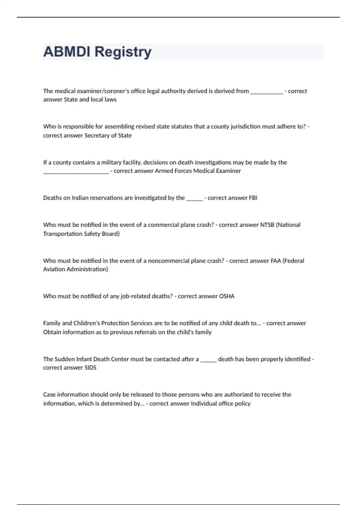 ABMDI Registry Questions with complete solution 2024 ABMDI Registry The medical examiner/coroner's office legal authority derived is derived from __________ - correct answer State and local laws Who is responsible for assembling revised state statutes that a county jurisdiction must adhere to? - correct answer Secretary of State If a county contains a military facility, decisions on death investigations may be made by the ____________________ - correct answer Armed Forces Medical Examiner Deaths on Indian reservations are investigated by the _____ - correct answer FBI Who must be notified in the event of a commercial plane crash? - correct answer NTSB (National Transportation Safety Board) Who must be notified in the event of a noncommercial plane crash? - correct answer FAA (Federal Aviation Administration)