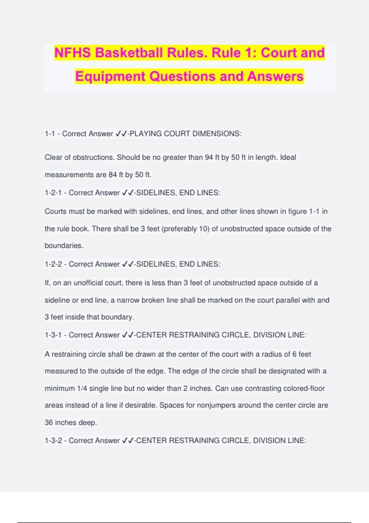 NFHS Basketball Rules. Rule 1: Court and Equipment Questions and Answers 1-1 - Correct Answer ️️ -PLAYING COURT DIMENSIONS: Clear of obstructions. Should be no greater than 94 ft by 50 ft in length. Ideal measurements are 84 ft by 50 ft. 1-2-1 - Correct Answer ️️ -SIDELINES, END LINES: Courts must be marked with sidelines, end lines, and other lines shown in figure 1-1 in the rule book. There shall be 3 feet (preferably 10) of unobstructed space outside of the boundaries. 1-2-2 - Correct Answer ️️ -SIDELINES, END LINES: If, on an unofficial court, there is less than 3 feet of unobstructed space outside of a sideline or end line, a narrow broken line shall be marked on the court parallel with and 3 feet inside that boundary. 1-3-1 - Correct Answer ️️ -CENTER RESTRAINING CIRCLE, DIVISION LINE: A restraining circle shall be drawn at the center of the court with a radius of 6 feet measured to the outside of the edge. The edge of the circle shall be designated with a minimum 1/4 single line but no wider than 2 inches. Can use contrasting colored-floor areas instead of a line if desirable. Spaces for nonjumpers around the center circle are 36 inches deep. 1-3-2 - Correct Answer ️️ -CENTER RESTRAINING CIRCLE, DIVISION LINE: A division line 2 inches wide, shall divide the court into two equal parts. If court is less than 74 feet long, it should be divided by two lines, each parallel to and 40 feet from the farther end line. 1-3-3 - Correct Answer ️️ -CENTER RESTRAINING CIRCLE, DIVISION LINE: Shadow border lines are permissible. Border lines that are the natural color of the court are permissible. The continuous outline must be clearly visible to officials. Logos in the center of the court should not distract from the visibility of the division line or center circle. 1-4-1 - Correct Answer ️️ -THREE-POINT LINE: A three point line, 2-inches wide in the form of a semicircle, shall be drawn at each end of the court. Semicircle has a radius of 19 feet 9 inches from the point in the middle of the free-throw lane directly below the center of the basket to the outside edge of the line. The semicircle shall be extended with a 2-inch line perpendicular to the end line, the length of which shall be 63 inches from the inside edge of the end line. 1-4-2 - Correct Answer ️️ -THREE POINT LINE: The three point line shall be the same color as the free-throw lane boundary lines and the free-throw circle. 1-5-1 - Correct Answer ️️ -FREE THROW LANE: A free-throw lane, 12 feet wide measured to the outside of each lane boundary, and the semicircle with the free-throw line as a diameter shall be marked at each end of the court. Dimensions and marking shown in figure 1-1 in the rule book. The lane space marks are not a part of the lane. 1-5-2 - Correct Answer ️️ -FREE THROW LANE: The lane space marks (2 by 8 inches) identify areas which extend 36 inches from the outer edge of the lane lines towards the sidelines. There are three lane spaces on each boundary line. 1-5-3 - Correct Answer ️️ -FREE THROW LANE: The free-throw lane line and the semicircle shall be the same color as the three point line. Contrasting colored-floor areas instead of lines are allowed. 1-6 - Correct Answer ️️ -FREE-THROW LINE