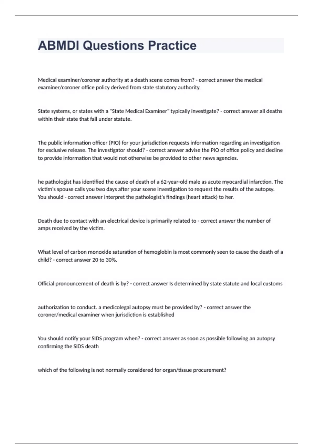 ABMDI Questions Practice Question and answers already passed 2024 ABMDI Questions Practice Medical examiner/coroner authority at a death scene comes from? - correct answer the medical examiner/coroner office policy derived from state statutory authority. State systems, or states with a "State Medical Examiner" typically investigate? - correct answer all deaths within their state that fall under statute. The public information officer (PIO) for your jurisdiction requests information regarding an investigation for exclusive release. The investigator should? - correct answer advise the PIO of office policy and decline to provide information that would not otherwise be provided to other news agencies. he pathologist has identified the cause of death of a 62-year-old male as acute myocardial infarction. The victim's spouse calls you two days after your scene investigation to request the results of the autopsy. You should - correct answer interpret the pathologist's findings (heart attack) to her. Death due to contact with an electrical device is primarily related to - correct answer the number of amps received by the victim. What level of carbon monoxide saturation of hemoglobin is most commonly seen to cause the death of a child? - correct answer 20 to 30%. Official pronouncement of death is by? - correct answer Is determined by state statute and local customs authorization to conduct. a medicolegal autopsy must be provided by? - correct answer the coroner/medical examiner when jurisdiction is established You should notify your SIDS program when? - correct answer as soon as possible following an autopsy confirming the SIDS death which of the following is not nor