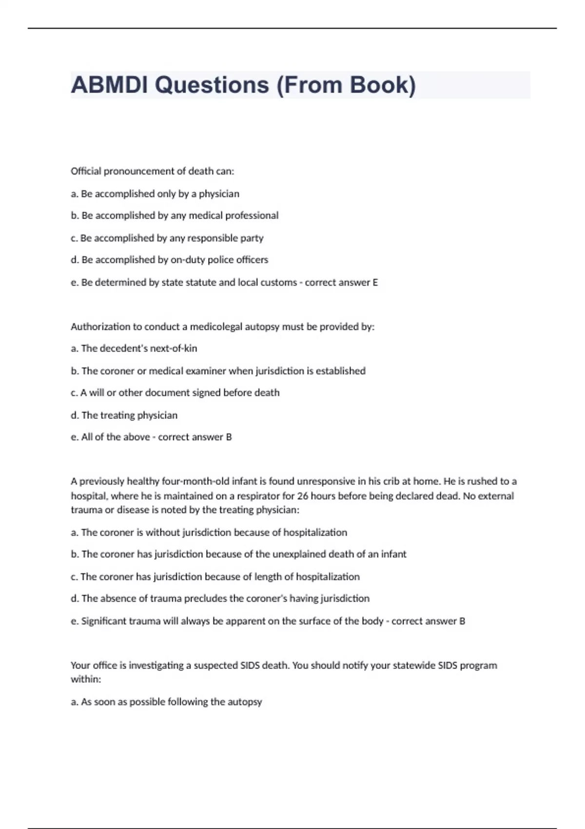 ABMDI Questions (From Book) Question and answers 2024 verified to passABMDI Questions (From Book) Official pronouncement of death can: a. Be accomplished only by a physician b. Be accomplished by any medical professional c. Be accomplished by any responsible party d. Be accomplished by on-duty police officers e. Be determined by state statute and local customs - correct answer E Authorization to conduct a medicolegal autopsy must be provided by: a. The decedent's next-of-kin b. The coroner or medical examiner when jurisdiction is established c. A will or other document signed before death d. The treating physician e. All of the above - correct answer B A previously healthy four-month-old infant is found unresponsive in his crib at home. He is rushed to a hospital, where he is maintained on a respirator for 26 hours before being declared dead. No external trauma or disease is noted by the treating physician: a. The coroner is without jurisdiction because of hospitalization b. The coroner has jurisdiction because of the unexplained death of an infant c. The coroner has jurisdiction because of length of hospitalization d. The absence of trauma precludes the coroner's having jurisdiction e. Significant trauma will always be apparent on the surface of the body - correct answer B Your office is investigating a suspected SIDS death. You should notify your statewide SIDS program within: a. As soon as possible following the autopsy b. Within 24 hours of the death c. Within 48 hours of the death d. Within 72 hours of the death e. Within one week of the death - correct answer A In general, which of the followi