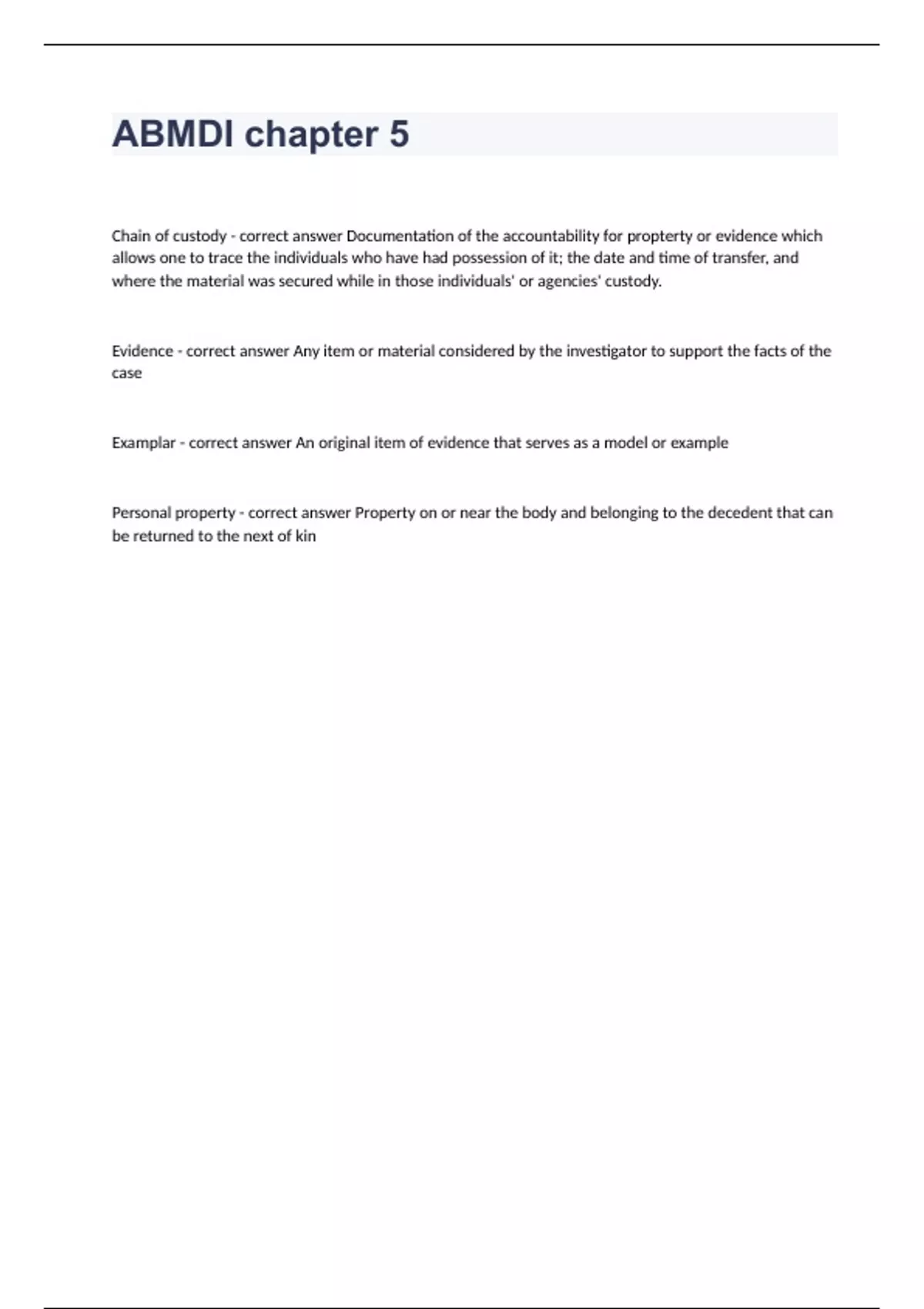 ABMDI chapter 5 Question and answers already passed 2024 ABMDI chapter 5 Chain of custody - correct answer Documentation of the accountability for propterty or evidence which allows one to trace the individuals who have had possession of it; the date and time of transfer, and where the material was secured while in those individuals' or agencies' custody. Evidence - correct answer Any item or material considered by the investigator to support the facts of the case Examplar - correct answer An original item of evidence that serves as a model or example Personal property - correct answer Property on or near the body and belonging to the decedent that can be returned to the next of