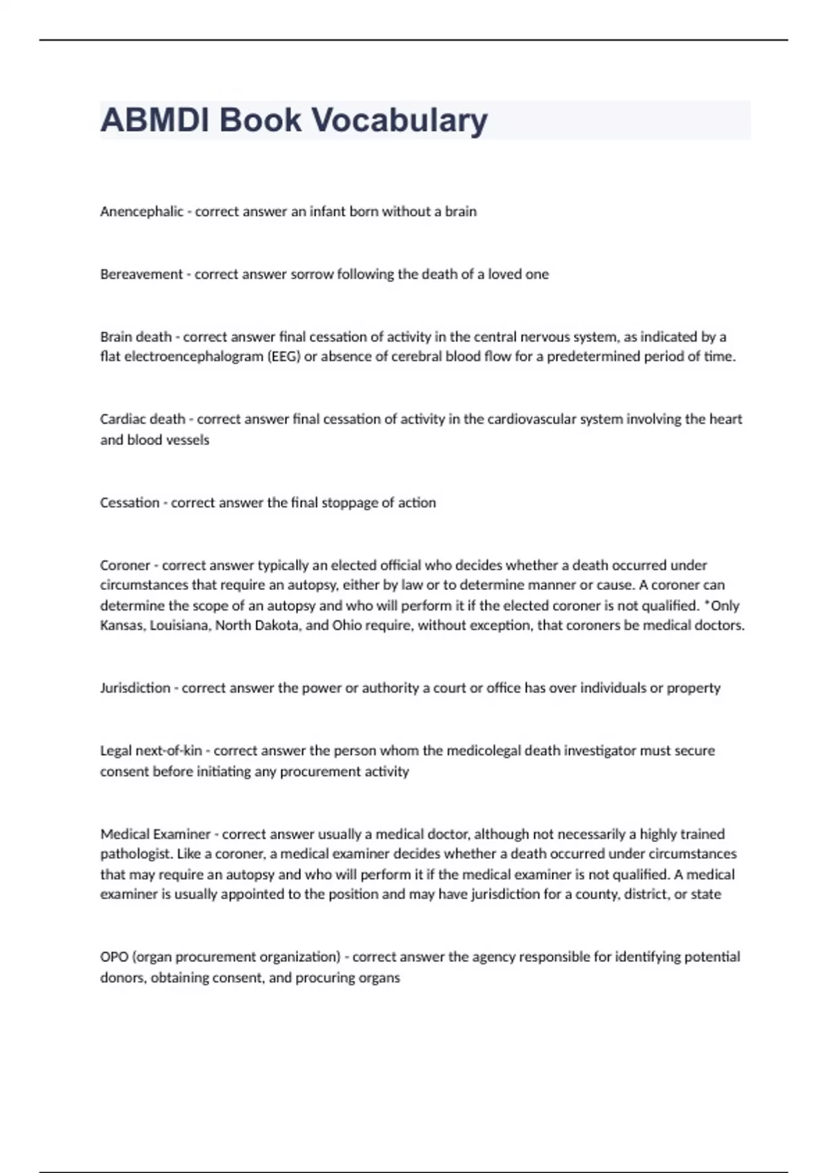 ABMDI Book Vocabulary Questions with complete solution 2024 ABMDI Book Vocabulary Anencephalic - correct answer an infant born without a brain Bereavement - correct answer sorrow following the death of a loved one Brain death - correct answer final cessation of activity in the central nervous system, as indicated by a flat electroencephalogram (EEG) or absence of cerebral blood flow for a predetermined period of time. Cardiac death - correct answer final cessation of activity in the cardiovascular system involving the heart and blood vessels Cessation - correct answer the final stoppage of action Coroner - correct answer typically an elected official who decides whether a death occurred under circumstances that require an autopsy, either by law or to determine manner or cause. A coroner can determine the scope of an autopsy and who will perform it if the elected coroner is not qualified. *Only Kansas, Louisiana, North Dakota, and Ohio require, without exception, that coroners be medical doctors.