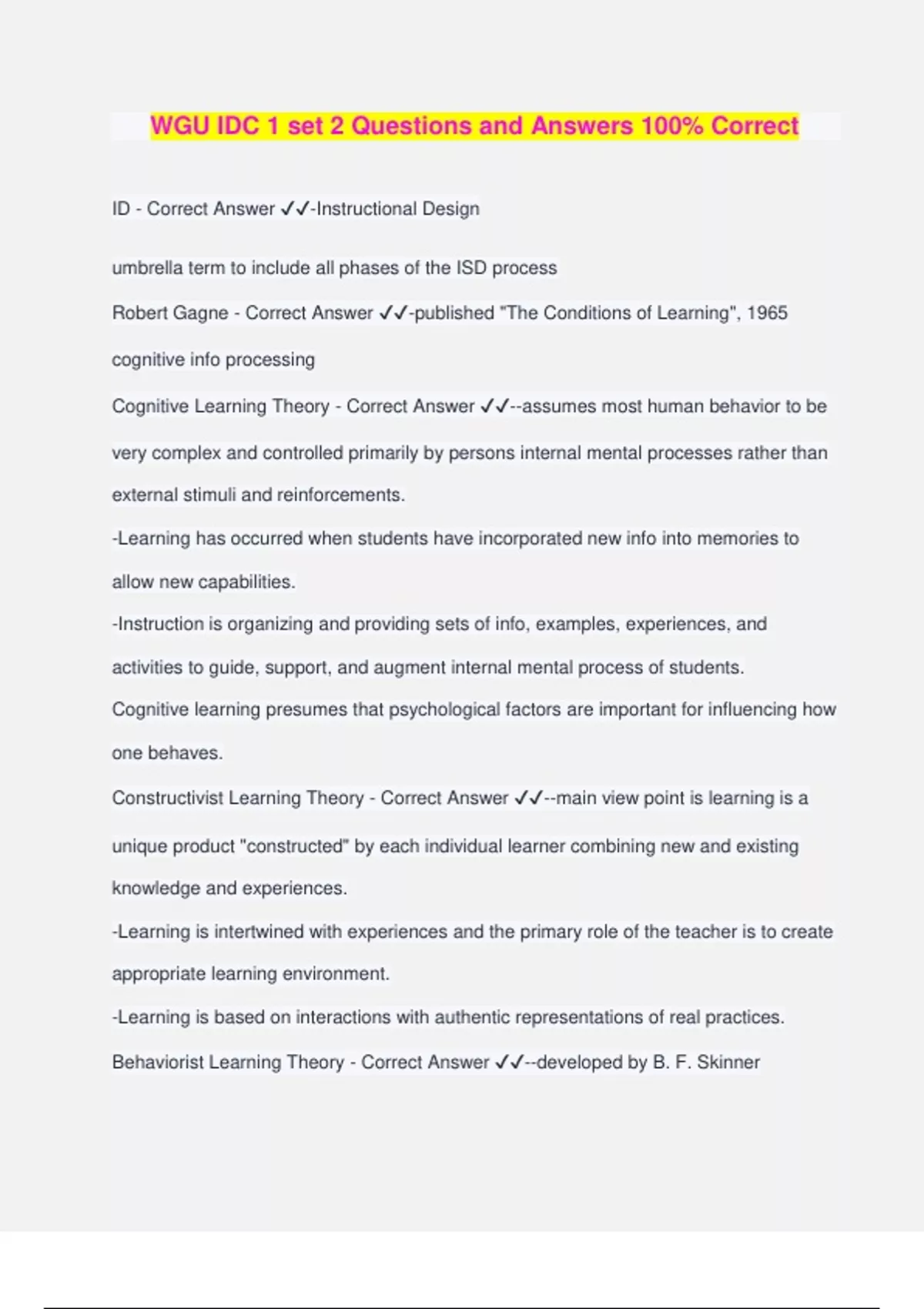 WGU IDC 1 set 2 Questions and Answers 100% Correct ID - Correct Answer ️️ -Instructional Design umbrella term to include all phases of the ISD process Robert Gagne - Correct Answer ️️ -published "The Conditions of Learning", 1965 cognitive info processing Cognitive Learning Theory - Correct Answer ️️ --assumes most human behavior to be very complex and controlled primarily by persons internal mental processes rather than external stimuli and reinforcements. -Learning has occurred when students have incorporated new info into memories to allow new capabilities. -Instruction is organizing and providing sets of info, examples, experiences, and activities to guide, support, and augment internal mental process of students. Cognitive learning presumes that psychological factors are important for influencing how one behaves. Constructivist Learning Theory - Correct Answer ️️ --main view point is learning is a unique product "constructed" by each individual learner combining new and existing knowledge and experiences. -Learning is intertwined with experiences and the primary role of the teacher is to create appropriate learning environment. -Learning is based on interactions with authentic representations of real practices. Behaviorist Learning Theory - Correct Answer ️️ --developed by B. F. Skinner -Three basic assumptions are held to be true: -First, learning is manifested by a change in behavior. -Second, the environment shapes behavior. -And third, the principles of contiguity (how close in time two events must be for a bond to be formed) and reinforcement (any means of increasing the likelihood that an event will be repeated) are central to explaining the learning process. -For behaviorism, learning is the acquisition of new behavior through conditioning. Behavioral learning assumes that people's environment (surroundings) cause people to behave in certain ways. Components of a Systems Approach Model - Correct Answer ️️ -1- Identif