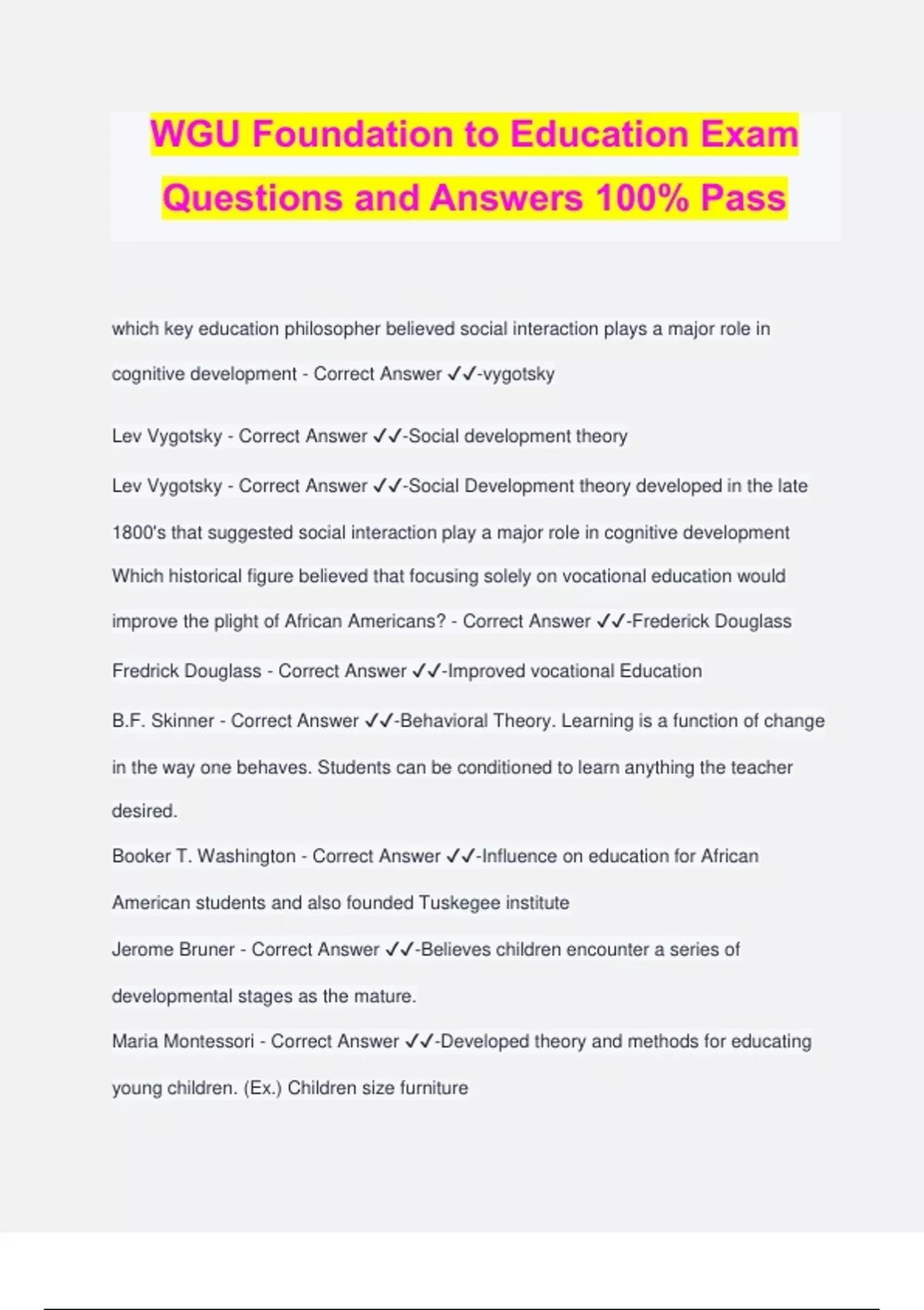 WGU Foundation to Education Exam Questions and Answers 100% Pass which key education philosopher believed social interaction plays a major role in cognitive development - Correct Answer ️️ -vygotsky Lev Vygotsky - Correct Answer ️️ -Social development theory Lev Vygotsky - Correct Answer ️️ -Social Development theory developed in the late 1800's that suggested social interaction play a major role in cognitive development Which historical figure believed that focusing solely on vocational education would improve the plight of African Americans? - Correct Answer ️️ -Frederick Douglass Fredrick Douglass - Correct Answer ️️ -Improved vocational Education B.F. Skinner - Correct Answer ️️ -Behavioral Theory. Learning is a function of change in the way one behaves. Students can be conditioned to learn anything the teacher desired. Booker T. Washington - Correct Answer ️️ -Influence on education for African American students and also founded Tuskegee institute Jerome Bruner - Correct Answer ️️ -Believes children encounter a series of developmental stages as the mature. Maria Montessori - Correct Answer ️️ -Developed theory and methods for educating young children. (Ex.) Children size furniture Robert Havighurst - Correct Answer ️️ -Believes that children must master specific developmental tasks to develop normally. He also believed there are teachable moments. Six stages of Development and growth. Horace Mann - Correct Answer ️️ -The historical figure most often spoke as the father of American education. Started common school movement for Public Schools. Henry Barnard - Correct Answer ️️ -Co- partner with Horace Mann Jean Piaget - Correct Answer ️️ -Cognitive Development. Four major stages that children lean facts, concepts and principles. Ella Flagg Young - Correct Answer ️️ -First Female Presiden