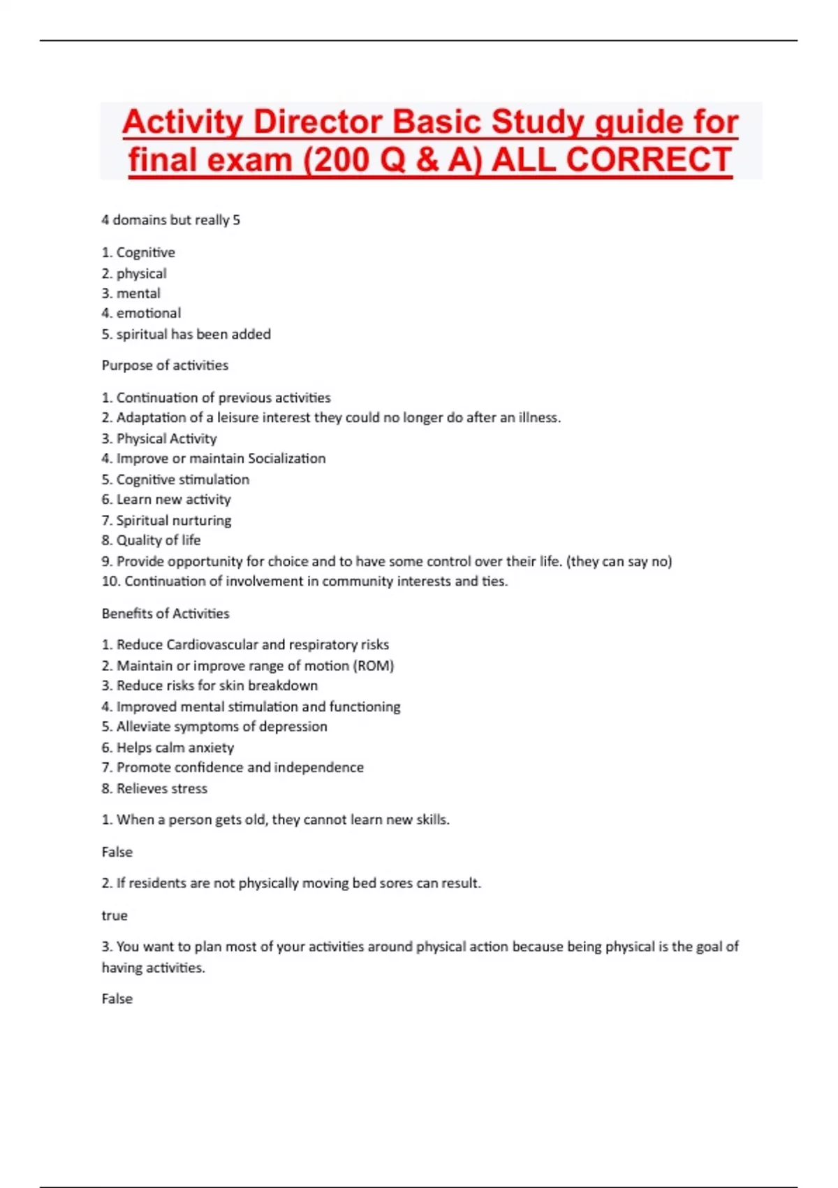 Activity Director Basic Study guide for final exam (200 Q & A) ALL CORRECT