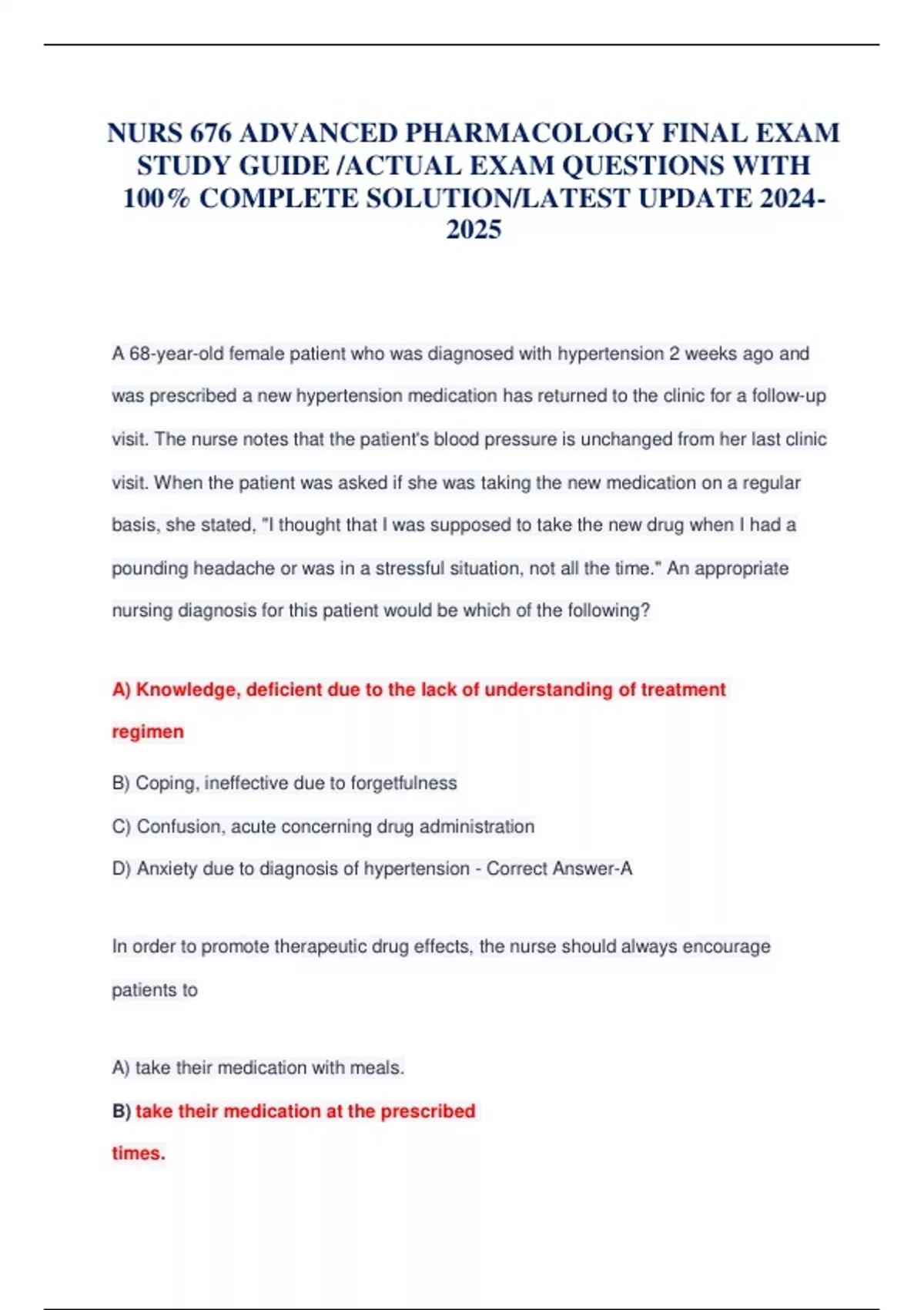 NURS 676 ADVANCED PHARMACOLOGY FINAL EXAM STUDY GUIDE /ACTUAL EXAM QUESTIONS WITH 100% COMPLETE SOLUTION/LATEST UPDATE