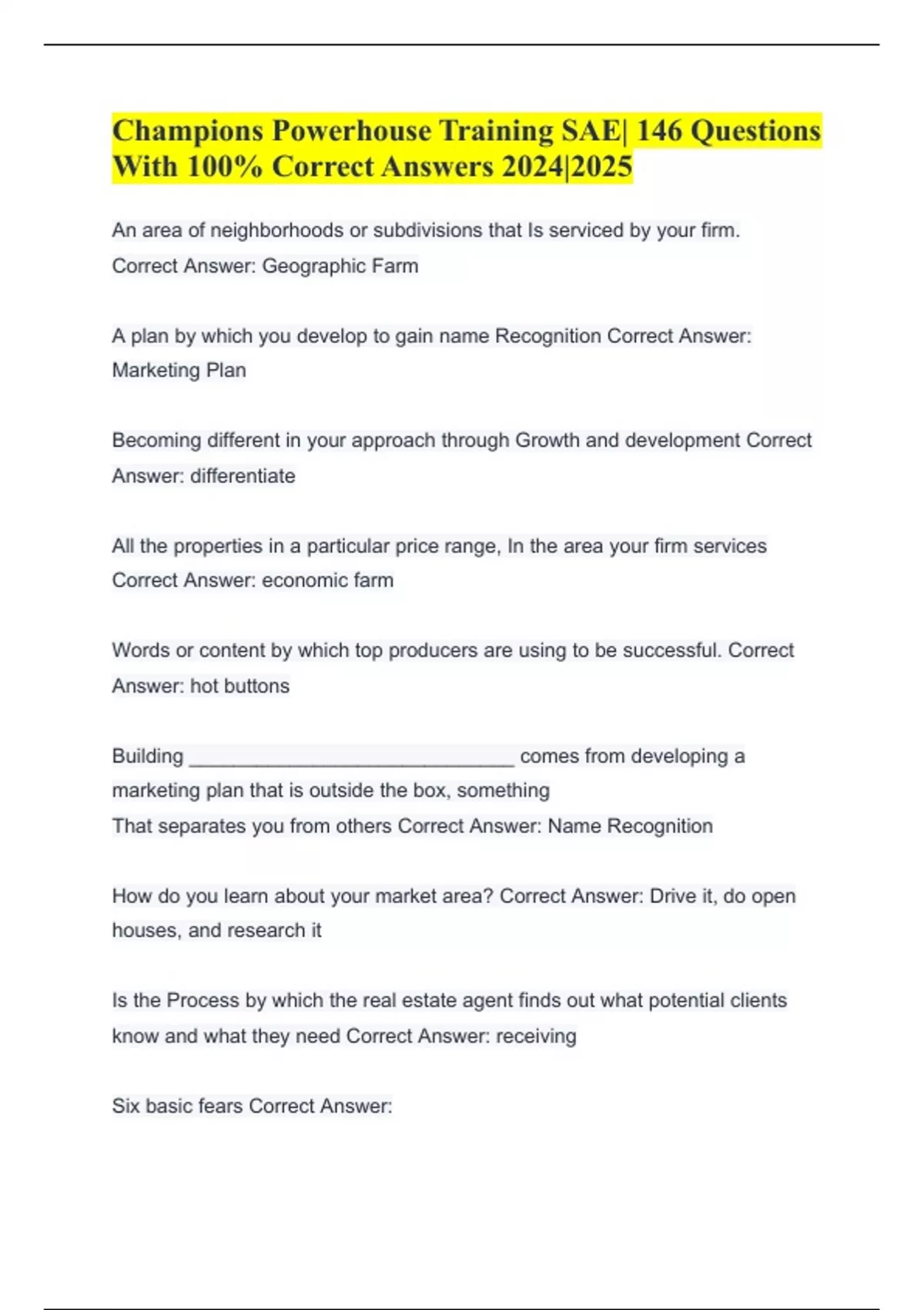 Champions Powerhouse Training SAE| 146 Questions With 100% Correct Answers 2024|2025 An area of neighborhoods or subdivisions that Is serviced by your firm. Correct Answer: Geographic Farm A plan by which you develop to gain name Recognition Correct Answer: Marketing Plan Becoming different in your approach through Growth and development Correct Answer: differentiate All the properties in a particular price range, In the area your firm services Correct Answer: economic farm Words or content by which top producers are using to be successful. Correct Answer: hot buttons Building _____________________________ comes from developing a marketing plan that is outside the box, something That separates you from others Correct Answer: Name Recognition How do you learn about your market area? Correct Answer: Drive it, do open houses, and research it Is the Process by which the real estate agent finds out what potential clients know and what they need Correct Answer: receiving Six basic fears Correct Answer: 1. The fear of poverty 2. The fear of criticism 3. The fear of ill health 4. The fear of lost love 5. The fear of death 6. The fear of old age To avoid this fear or to deal with this fear one must have a budget and stick to The budget. Correct Answer: fear of poverty This fear is one we all must accept. Correct Answer: fear of criticism