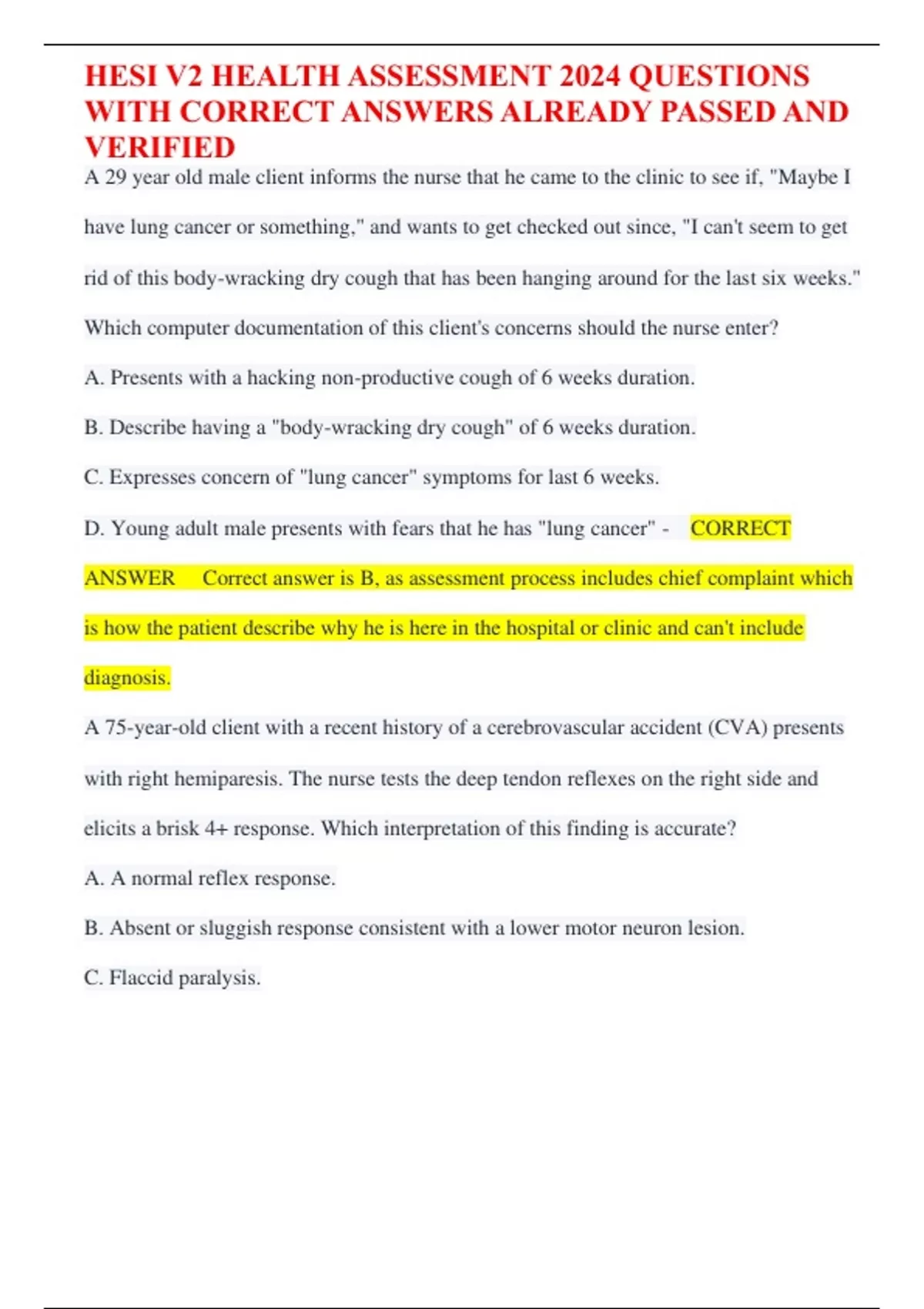 HESI V2 HEALTH ASSESSMENT 2024 QUESTIONS WITH CORRECT ANSWERS ALREADY PASSED AND VERIFIED