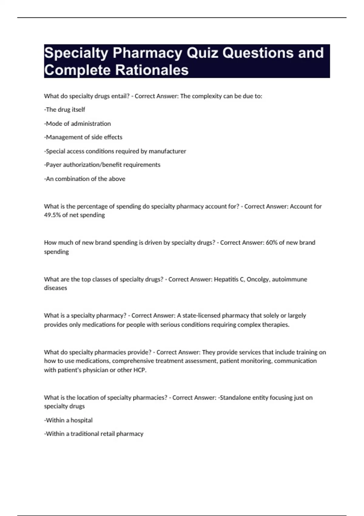 Specialty Pharmacy Quiz Questions and Complete Rationales