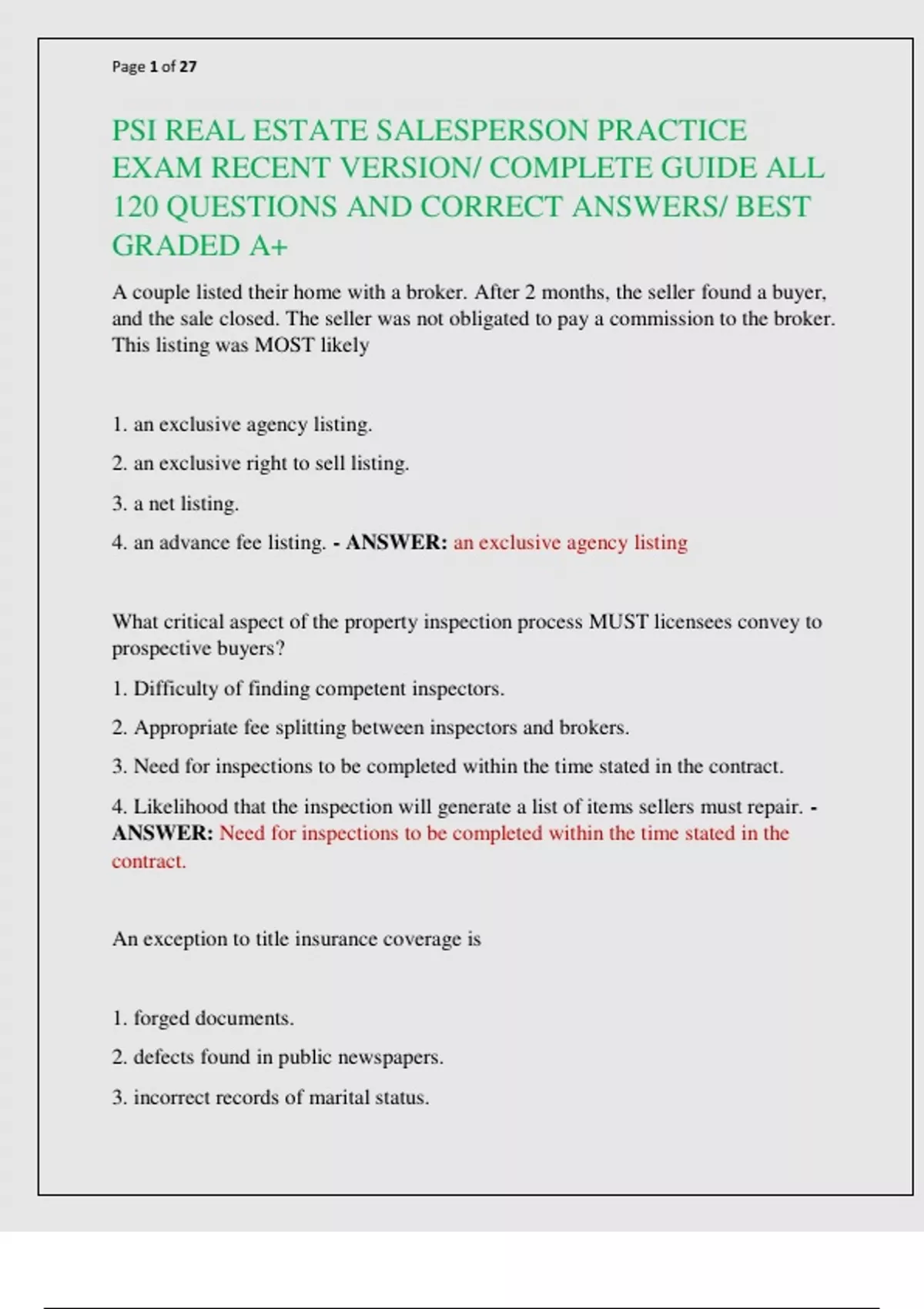 PSI REAL ESTATE SALESPERSON PRACTICE EXAM RECENT VERSION/ COMPLETE GUIDE ALL 120 QUESTIONS AND CORRECT ANSWERS/ BEST GRADED A+