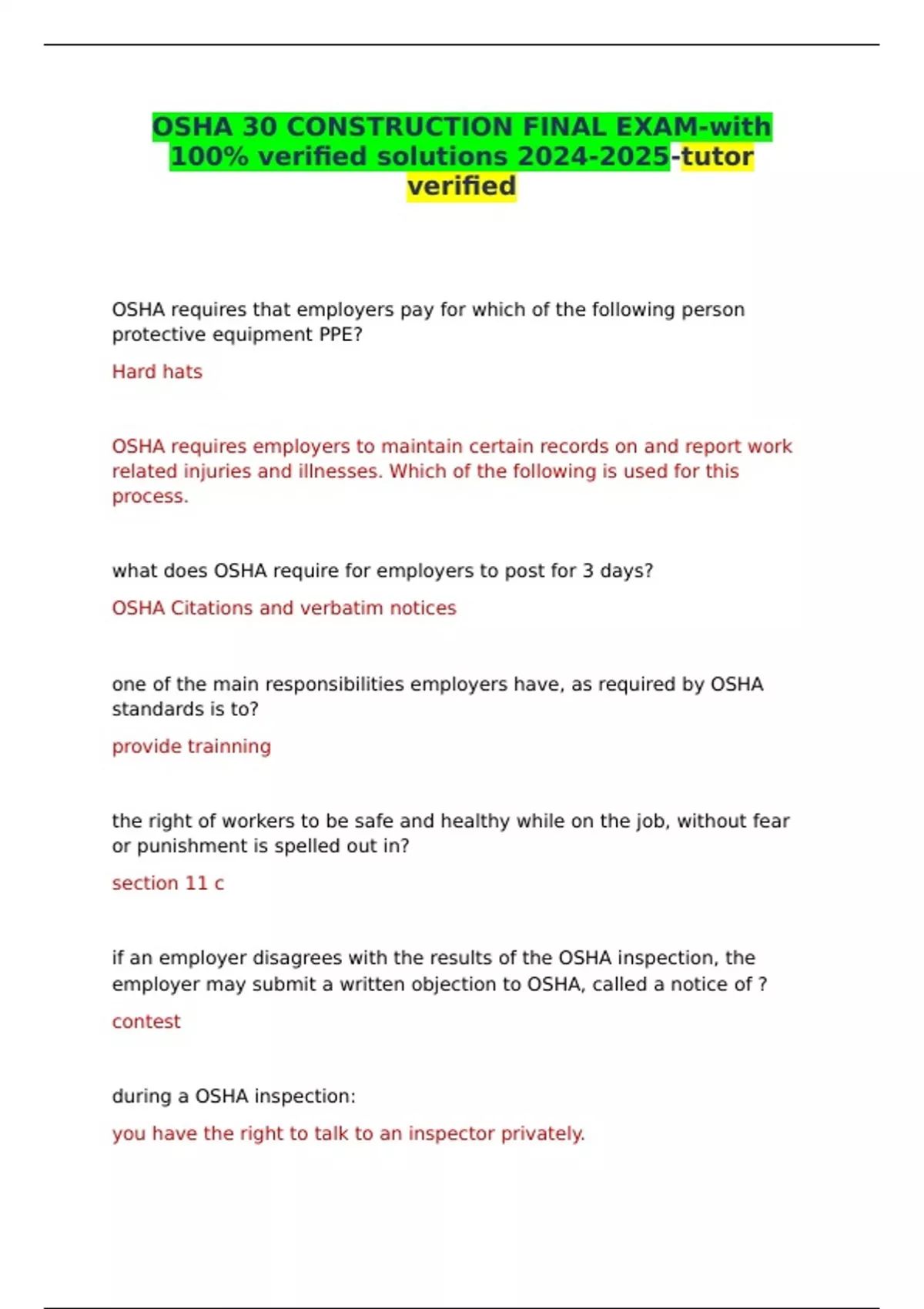 OSHA 30 CONSTRUCTION FINAL EXAM-with 100% verified solutions -tutor verified