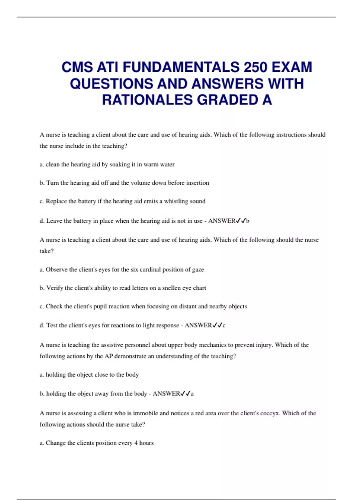 CMS ATI FUNDAMENTALS 250 EXAM QUESTIONS AND ANSWERS WITH RATIONALES GRADED A.