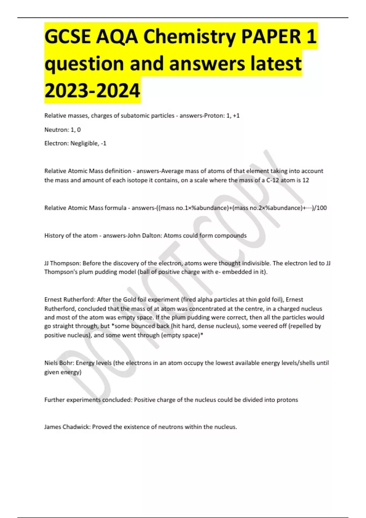 GCSE AQA Chemistry PAPER 1 question and answers latest Relative masses, charges of subatomic particles - answers-Proton: 1, +1 Neutron: 1, 0 Electron: Negligible, -1 Relative Atomic Mass definition - answers-Average mass of atoms of that element taking into account the mass and amount of each isotope it contains, on a scale where the mass of a C-12 atom is 12