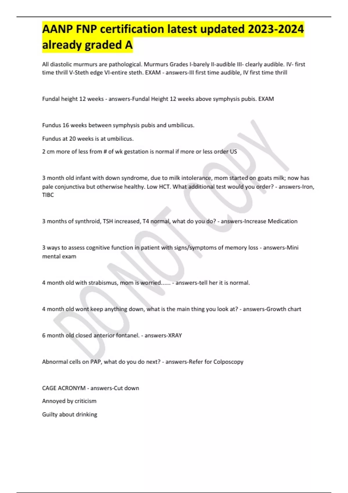 AANP FNP certification latest updated already graded A All diastolic murmurs are pathological. Murmurs Grades I-barely II-audible III- clearly audible. IV- first time thrill V-Steth edge VI-entire steth. EXAM - answers-III first time audible, IV first time thrill Fundal height 12 weeks - answers-Fundal Height 12 weeks above symphysis pubis. EXAM