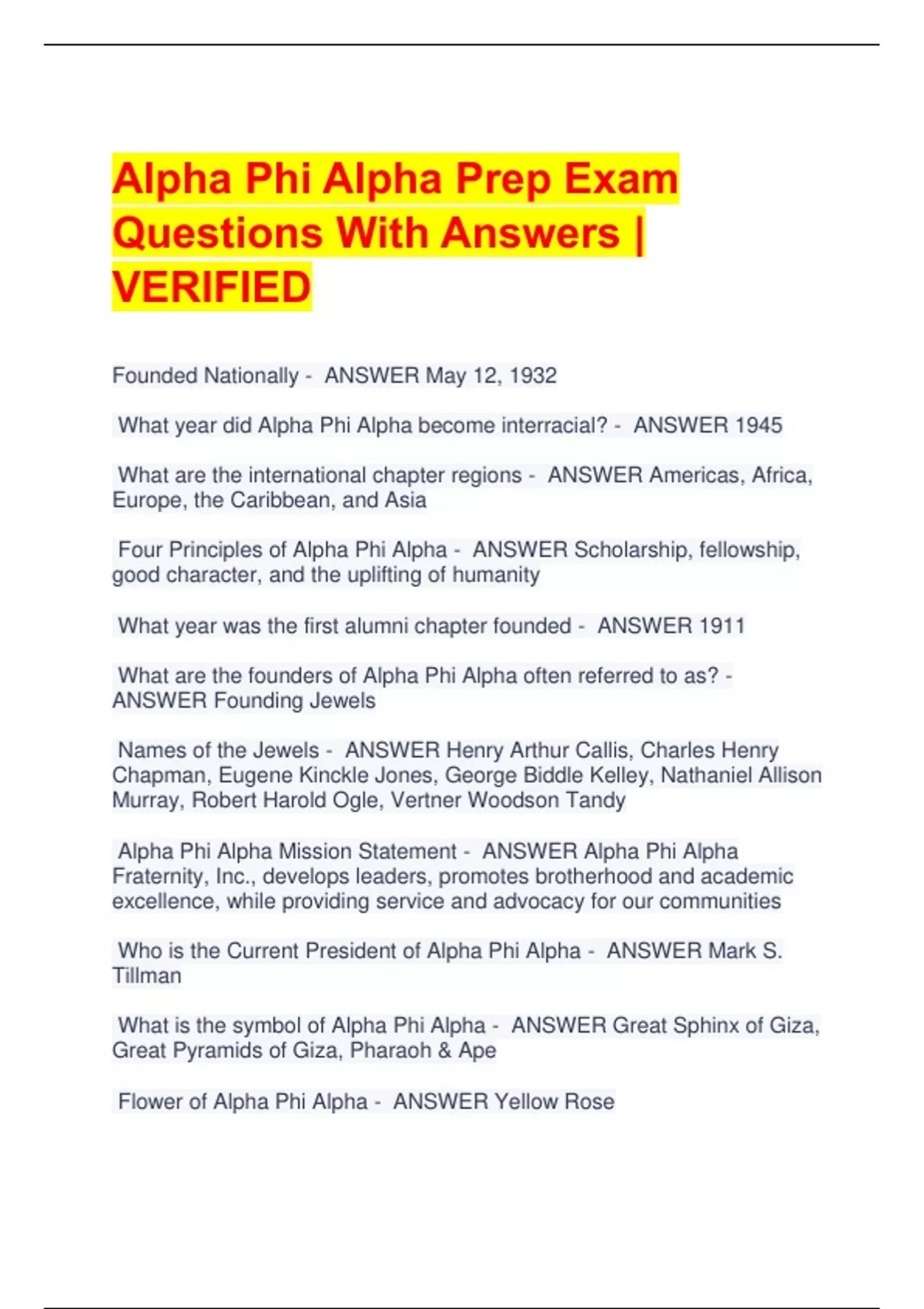 Alpha Phi Alpha Prep Exam Questions With Answers | VERIFIED Founded Nationally - ANSWER May 12, 1932 What year did Alpha Phi Alpha become interracial? - ANSWER 1945 What are the international chapter regions - ANSWER Americas, Africa, Europe, the Caribbean, and Asia Four Principles of Alpha Phi Alpha - ANSWER Scholarship, fellowship, good character, and the uplifting of humanity What year was the first alumni chapter founded - ANSWER 1911 What are the founders of Alpha Phi Alpha often referred to as? - ANSWER Founding Jewels Names of the Jewels - ANSWER Henry Arthur Callis, Charles Henry Chapman, Eugene Kinckle Jones, George Biddle Kelley, Nathaniel Allison Murray, Robert Harold Ogle, Vertner Woodson Tandy Alpha Phi Alpha Mission Statement - ANSWER Alpha Phi Alpha Fraternity, Inc., develops leaders, promotes brotherhood and academic excellence, while providing service and advocacy for our communities Who is the Current President of Alpha Phi Alpha - ANSWER Mark S. Tillman What is the symbol of Alpha Phi Alpha - ANSWER Great Sphinx of Giza, Great Pyramids of Giza, Pharaoh & Ape Flower of Alpha Phi Alpha - ANSWER Yellow Rose Where are the Headquarters Located? - ANSWER Baltimore, Maryland Motto - ANSWER First of All, Servants of All, We Shall Transcend All Aims of Alpha Phi Alpha - ANSWER Manly Deeds, Scholarship, and Love for All Mankind Where was the first international Charter Founded? - ANSWER University of Toronto in 1908 What city was the first alumni chapter founded? - ANSWER Louisville, Kentucky What are the official associations of Alpha Phi Alpha? - ANSWER National Pan-Hellenic Council North-American Interfraternity Conference March of Dimes Head Start Boy Scouts of America Big Brothers Big Sisters of America Name the 3 Stages of ALPHA? - ANSWER First stage of Alpha Social Study club Second stage of Alpha Literary Society Final Stage of Alpha Fraternity Who came up with the name for Alpha Phi Alpha? - ANSWER Jewel Henry Arthur Callis Who is the mother of Alpha Phi Alpha Incorporated? - ANSWER Mrs. Annie C. Singleton Who were the first initiates of Alpha Phi Alpha? - ANSWER Jewel Eugene Kinckle Jones, Gordon Jones, Lemuel Graves Explain the Shield - ANSWER Sphinx- Symbolizes secrecy Fasces - Symbolizes strength due to unity Dove - Symbol of purity and peace Torch in Hand - Symbolizes intelligence and enlightenment to the world 7 Stars- symbolizes Jewels 1906 - is the founding year Knowledge and achievement surround AoA What are the national programs for Alpha Phi Alpha? - ANSWER Go to High School, Go to College- (established in 1919) a Hopeless People (established in 1930) Project Alpha (established in 1980) Brother's Keeper (established in 2010) What is the official publication of Alpha Phi Alpha? - ANSWER The Sphinx How is the statue of the Great Sphinx of Giza significant to Alpha? - ANSWER The oldest, largest, most magnificent statue of its kind - stands for the history and size of the fraternity. Who were the first 10 general presidents? - ANSWER Big Brother Morris Alvin Morrison () Big Brother Roscoe C. Giles () Big Brother Frederick H. Miller () Big Brother Charles H. Gavin