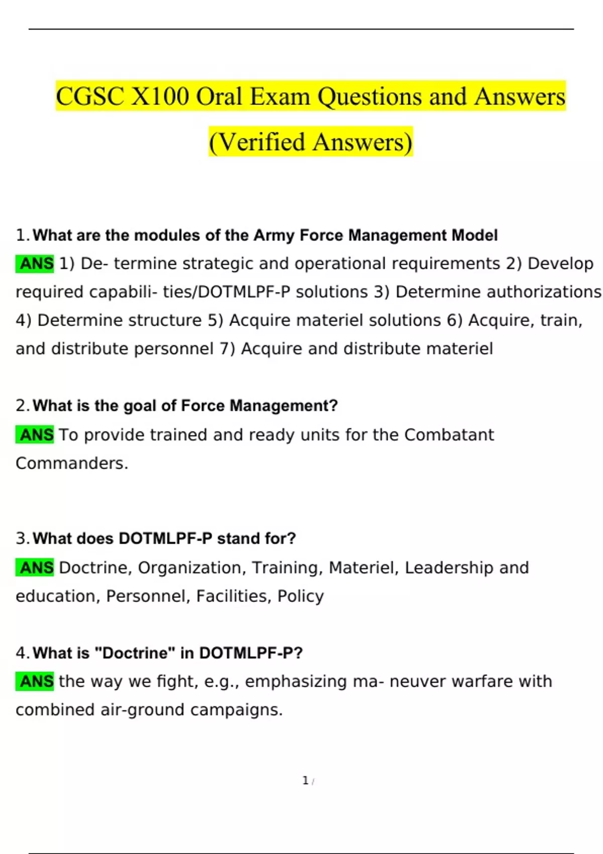CGSC X100 Exam Expected Questions and Answers (Verified by Expert) CGSC X100 Exam Expected Questions and Answers (Verified by Expert) CGSC X100 Exam Expected Questions and Answers (Verified by Expert) CGSC X100 Oral Exam Questions and Answers (Verified Answers) 1. What are the modules of the Army Force Management Model ANS 1) De- termine strategic and operational requirements 2) Develop required capabili- ties/DOTMLPF-P solutions 3) Determine authorizations 4) Determine structure 5) Acquire materiel solutions 6) Acquire, train, and distribute personnel 7) Acquire and distribute materiel 2. What is the goal of Force Management? ANS To provide trained and ready units for the Combatant Commanders. 3. What does DOTMLPF-P stand for? ANS Doctrine, Organization, Training, Materiel, Leadership and education, Personnel, Facilities, Policy 4. What is "Doctrine" in DOTMLPF-P? ANS the way we fight, e.g., emphasizing ma- neuver warfare with combined air-ground campaigns. 5. What is "Organization" in DOTMLPF-P? ANS how we organize to fight; divisions, air wings, Marine-Air Ground Task Forces (MAGTFs), etc 6. What is "Training" in DOTMLPF-P? ANS how we prepare to fight tactically; basic training to advanced individual training, various types of unit training, joint exercises, etc 7. What is "Materiel" in DOTMLPF-P? ANS all the "stuff" necessary to equip the forces, that is, weapons, spares, etc. so we can operate effectively 8. What is "Leadership and education" in DOTMLPF-P? ANS how we prepare lead- ers to lead the fight from squad leader to 4-star general/admiral; professional development 9. What is "Personnel" in DOTMLPF-P? ANS availability of qualified people for peace- time, wartime, and various contingency operations 10. What is "Facilities" in DOTMLPF-P? ANS real property; installations and industrial facilities (e.g. government owned ammunition production facilities) that support the forces 11. What is "Policy" in DOTMLPF-P? ANS the administrative rules that regulate how we operate 12. What is the objective of JCIDS? ANS to resolve identified capability gaps, per- ceived deficiencies, or shortcomings in the current force and to develop a balanced and synchronized DOTMLPF-P solution proposal that is affordable, militarily useful, supportable to the combatant commanders, and based on mature technology 13. What is the purpose of Army PPBE? ANS To establish, justify, and acquire the fiscal and manpower resources needed to accomplish the Army's assigned missions in executing the defense strategy 14. What is CBA used for? ANS to identify solutions to current and future capability gaps and the Army's ability to carry out required warfighting missions and func- tions. CBA is an analytical approach to review capability gaps and recommend whether the gaps can be addressed by nonmaterial or materiel means, or both (DOTMLPF-P);consists of 3 phases; output of the 3rd phase is the identification of potential solutions in DOTMLPF-P format 15. What does JCIDS stand for? ANS Joint Capabilities Integration and Development System 16. What is the Defense Acquisition System? ANS It develops, tests, fields, and sustains new materiel solutions. it consists of 5 phases and 3 milestone decision with B being most important. The end result is a materiel solution is produced, operated, and maintained within Army force. 17. What is a Materiel Development Decision (MDD)? ANS It is a point in time where the JCIDS analysis has identified a capability gap/need and a MDD review has determined a materiel solution is needed. It is the formal point that initiates the Materiel Solutions Analysis (MSA) Phase. 18. Describe Service responsibilities under Title 10 USC. ANS By law, services are responsible for providing sustainment and logistics to their own forces - recruit, organize, supply, equip, train, maintain/service, mobilize/demobilize, administer, building/property 19. What is Directive Authority For Logistics (DAFL)? ANS It is a COCOM authority that applies to assigned forces; in crisis or war, CCDR may use facilities and supplies of all forces to accomplish a mission. 20. What is an Inter Service Support Agreement (ISSA)? ANS An agreement made between two services for logistics support