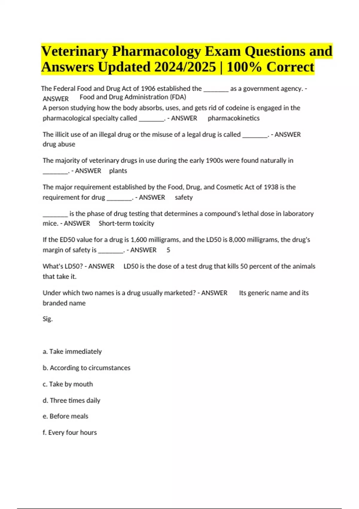 Veterinary Pharmacology Exam Questions and Answers, Updated 2024/2025 | 100% Correct Answers. The Federal Food and Drug Act of 1906 established the _______ as a government agency. - ANSWER Food and Drug Administration (FDA) A person studying how the body absorbs, uses, and gets rid of codeine is engaged in the pharmacological specialty called _______. - ANSWER pharmacokinetics The illicit use of an illegal drug or the misuse of a legal drug is called _______. - ANSWER drug abuse The majority of veterinary drugs in use during the early 1900s were found naturally in _______. - ANSWER plants The major requirement established by the Food, Drug, and Cosmetic Act of 1938 is the requirement for drug _______. - ANSWER safety _______ is the phase of drug testing that determines a compound's lethal dose in laboratory mice. - ANSWER Short-term toxicity If the ED50 value for a drug is 1,600 milligrams, and the LD50 is 8,000 milligrams, the drug's margin of safety is _______. - ANSWER 5 What's LD50? - ANSWER LD50 is the dose of a test drug that kills 50 percent of the animals that take it. Under which two names is a drug usually marketed? - ANSWER Its generic name and its branded name Sig. a. Take immediately b. According to circumstances c. Take by mouth d. Three times daily e. Before meals f. Every four hours Veterinary Pharmacology Exam Questions and Answers Updated 2024/2025 | 100% Correct g. Twice a day h. Every day i. Write on the label - ANSWER i. Write on the label b.i.d. a. Take immediately b. According to circumstances c. Take by mouth d. Three times daily e. Before meals f. Every four hours g. Twice a day h. Every day i. Write on the label - ANSWER g. Twice a day q.d. a. Take immediately b. According to circumstances c. Take by mouth d. Three times daily e. Before meals f. Every four hours g. Twice a day h. Every day i. Write on the label - ANSWER h. Every day a.c. a. Take immediately b. According to circumstances c. Take by mouth d. Three times daily e. Before meals f. Every four hours g. Twice a day h. Every day i. Write on the label - ANSWER e. Before meals q.4.h. a. Take immediately b. According to circumstances c. Take by mouth d. Three times daily e. Before meals f. Every four hours g. Twice a day h. Every day i. Write on the label - ANSWER f. Every four hours t.i.d. a. Take immediately b. According to circumstances c. Take by mouth d. Three times daily e. Before meals f. Every four hours g. Twice a day h. Every day i. Write on the label - ANSWER d. Three times daily p.r.n a. Take immediately b. According to circumstances c. Take by mouth d. Three times daily e. Before meals f. Every four hours g. Twice a day h. Every day i. Write on the label - ANSWER b. According to circumstances p.o. a. Take immediately b. According to circumstances c. Take by mouth d. Three times daily e. Before meals f. Every four hours g. Twice a day h. Every day i. Write on the label - ANSWER c. Take by mouth stat a. Take immediately b. According to circumstances c. Take by mouth d. Three times daily e. Before meals f. Every four hours g. Twice a day h. Every day i. Write on the label - ANSWER a. Take immediately Veterinary Pharmacology - ANSWER The study and use of drugs in animal healthcare Materia Medica - ANSWER The study of the physical and chemical characteristics of materials used as medicine Pharmacotherapeutics - ANSWER The field that examines the treatment of disease with medicine Pharmacokinetics - ANSWER The study of the absorption, blood levels, distribution, biotransformation, and excretion of drugs Biotransformation - ANSWER The series of chemical alterations of a drug occurring in the body Drug Abuse - ANSWER Illicit use of an illegal drug or the improper use of a legal prescription drug Carcinogenicity - ANSWER The ability or tendency to produce cancer Teratogenicity - ANSWER The capacity to cause birth defects Toxicity Evaluation - ANSWER Assessing whether a drug causes convulsions, seizures, or changes in blood pressure, heart rate, respiration rate, sleep, or muscle tension Effective Does (ED50) - ANSWER Amount of drug that produces a desired effect. The effective dose must cause a defined effect in 50% of the animals that take it. Lethal Dose-50% (LD50) - ANSWER The dose of a test drug that kills 50% of the animals that take it Margin of Safety - ANSWER The difference in magnitude between a drug's effective dose and lethal dose Systems Oriented Screen - ANSWER A test of a drug's effect on a particular physiological system Abbreviated New Drug Application (ANDA) - ANSWER Application for generic equivalent approval Generic Drug - ANSWER Determined to be the therapeutic equal of a drug whose patent has expired Gas a. Dose form given by inhalation b. Given as a bolus or by infusion c. A thin gelatin shell that contains the active drug in the form of a dry powder or liquid d. Can be given to the animal by hand e. Is given to the animal by mixing with food f. Dose forms that are always supplied as sterile preparations g. A dose form that's usually applied directly to the skin surface h. Also called a parenteral preparation i. Dose form that provides the fastest onset of drug action j. A liquid suspension - ANSWER a. Dose form given by inhalation Capsule a. Dose form given by inhalation b. Given as a bolus or by infusion c. A thin gelatin shell that contains the active drug in the form of a dry powder or liquid d. Can be given to the animal by hand e. Is given to the animal by mixing with food f. Dose forms that are always supplied as sterile preparations g. A dose form that's usually applied directly to the skin surface h. Also called a parenteral preparation i. Dose form that provides the fastest onset of drug action j. A liquid suspension - ANSWER c. A thin gelatin shell that contains the active drug in the form of a dry powder or liquid d. Can be given to the animal by hand Powder a. Dose form given by inhalation b. Given as a bolus or by infusion c. A thin gelatin shell that contains the act