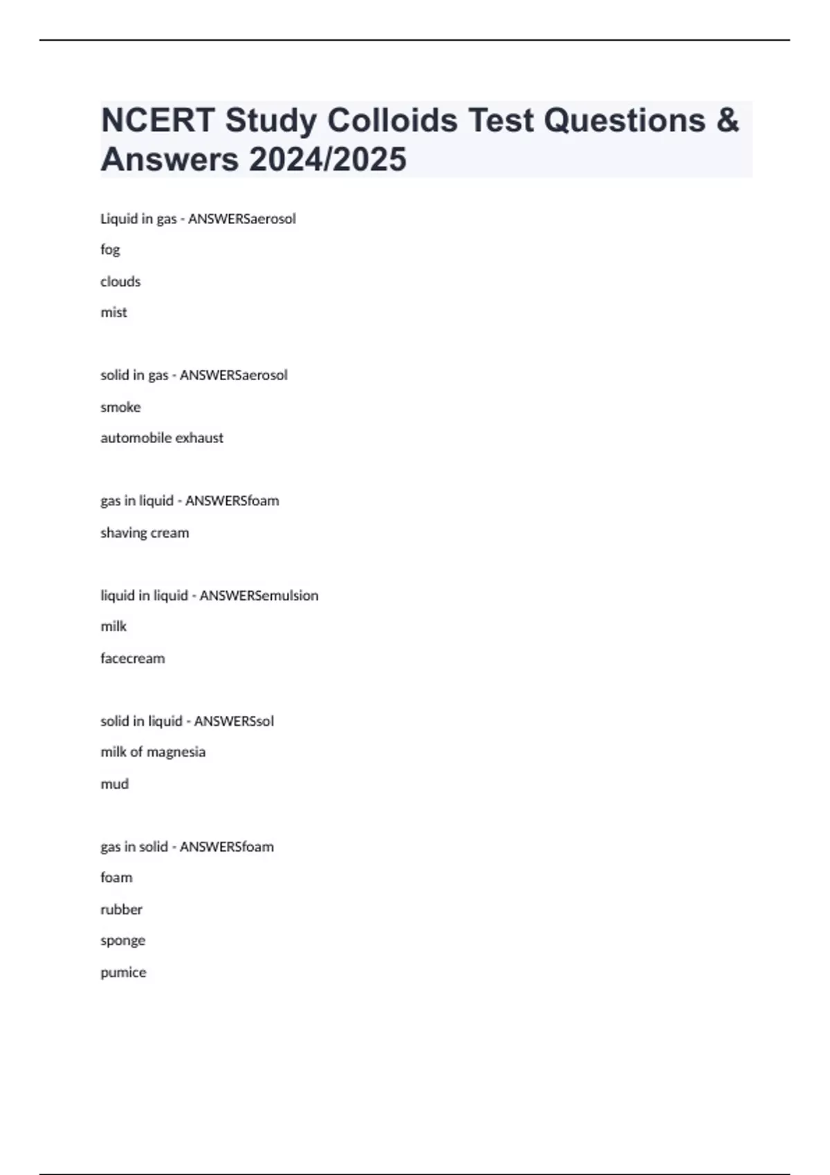 NCERT Study Colloids Test Questions & Answers 2024/2025
