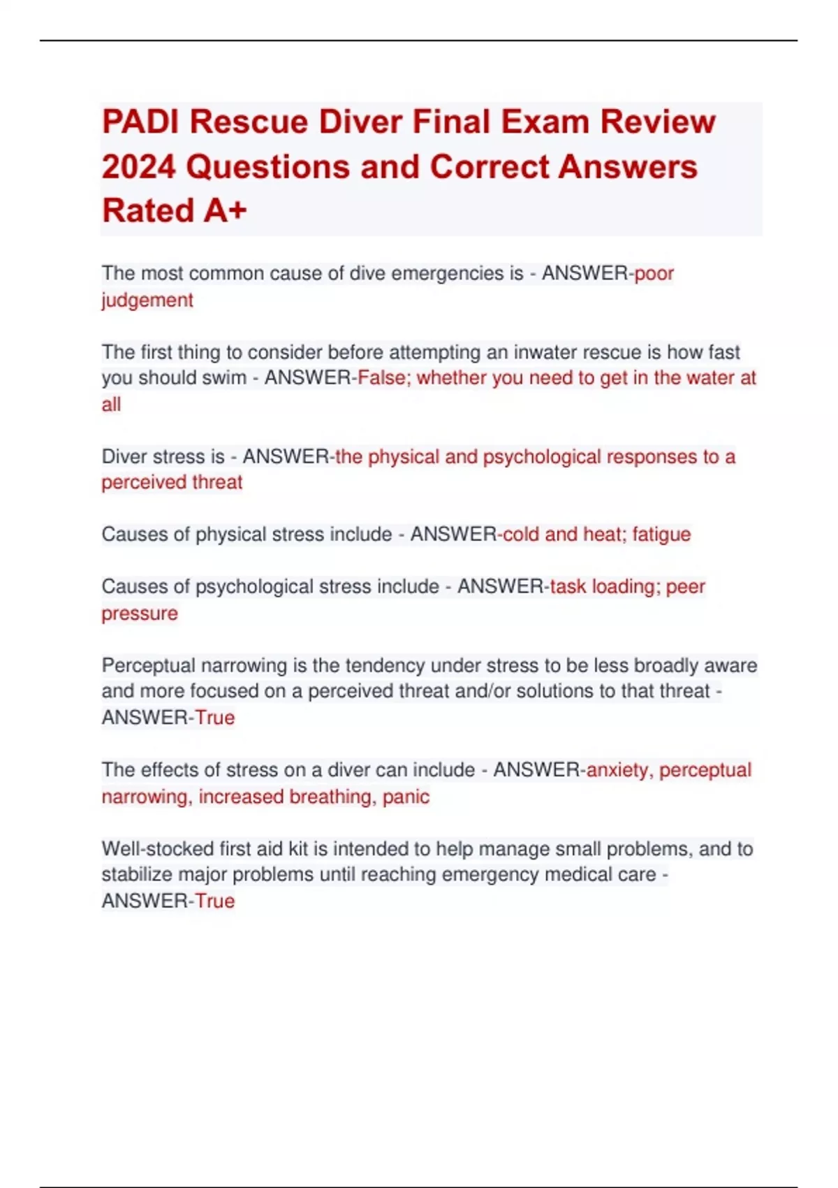 PADI Rescue Diver Final Exam Review 2024 Questions and Correct Answers Rated A+