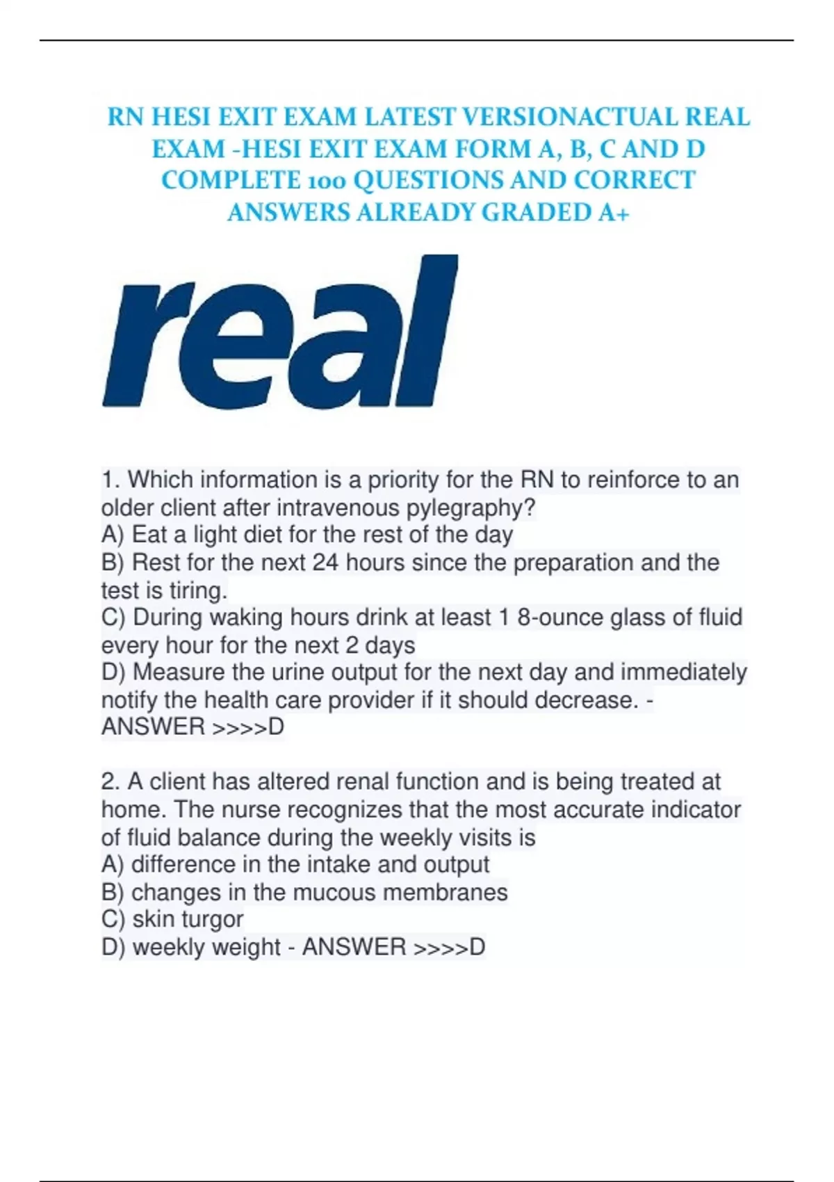 RN HESI EXIT EXAM LATEST VERSIONACTUAL REAL EXAM -HESI EXIT EXAM FORM A, B, C AND D COMPLETE 100 QUESTIONS AND CORRECT ANSWERS ALREADY GRADED A+