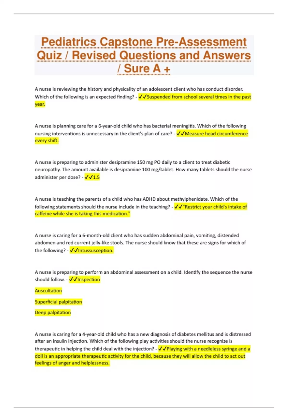 Pediatrics Capstone Pre-Assessment Quiz / Revised Questions and Answers / Sure A +